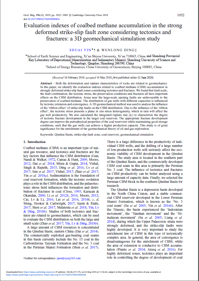 根據(jù)2019年9月份公布的ESI數(shù)據(jù)庫最新顯示,地球科學(xué)與工程學(xué)院一篇論文成功入選地質(zhì)學(xué)領(lǐng)域TOP1%高被引論文,一年內(nèi)被引頻次達(dá)到9次。該論文題為“Evaluation indexes of coalbed methane accumulation in the strong deformed strike-slip fault zone considering tectonics and fractures: A 3D geomechanical simulation study”,于2019年6月發(fā)表于地質(zhì)類期刊《Geological Magazine》。第一作者為地球科學(xué)與工程學(xué)院尹帥博士,第一單位為西安石油大學(xué)。