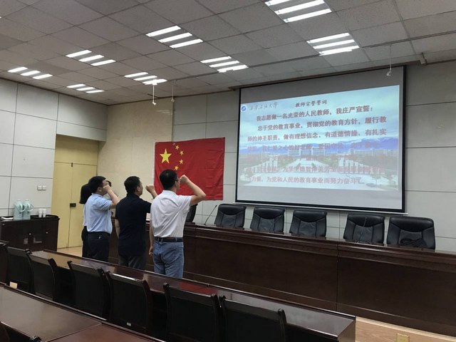 9月12日下午,理學(xué)院全體教職工著正裝在第三會議室舉行了莊嚴(yán)的教師宣誓儀式。宣誓儀式由院黨黨委書記廖敏主持。