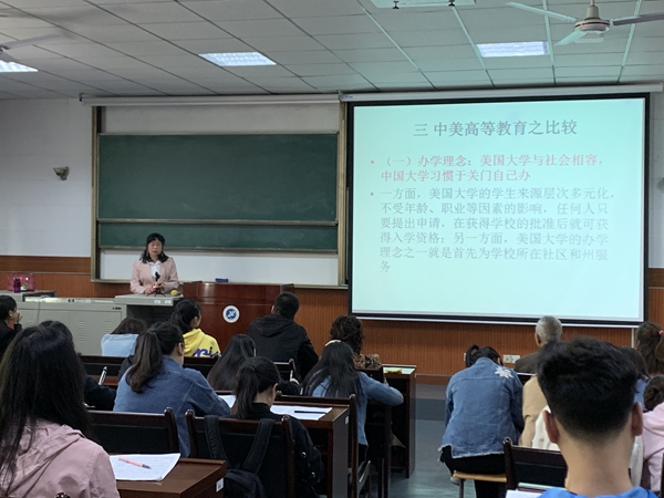 朱海娟副教授,畢業(yè)于西北農(nóng)林科技大學(xué)獲博士學(xué)位,西北大學(xué)博士后,美國路易斯安那大學(xué)拉法葉分校訪問學(xué)者,報告的題目為《中美高等教育比較研究》。報告主要內(nèi)容對比了中美高等教育在辦學(xué)理念、教育目標(biāo)、教學(xué)組織方式的差異,并通過學(xué)術(shù)誠實教育、教學(xué)設(shè)施配置、畢業(yè)典禮等細節(jié),指出了美國高等教育中普遍存在的開放、以人為本、注重綜合素質(zhì)培養(yǎng)、教學(xué)方式靈活等特征。