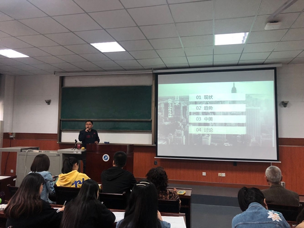 陳丁博士,畢業(yè)于西安交通大學(xué)獲博士學(xué)位,美國堪薩斯大學(xué)訪問學(xué)者,報告題目為《多棱鏡下的美國》。報告主要內(nèi)容從社會、教育、民生、環(huán)境等多個角度,展示、分析當(dāng)今美國的發(fā)展現(xiàn)狀;通過對比美國十年間的變化,探討了未來美國的可能發(fā)展走勢;并對中美間未來的關(guān)系特征提出自己的判斷,并對計劃前往美國學(xué)習(xí)、訪問、工作的聽眾,提供了個人建議。