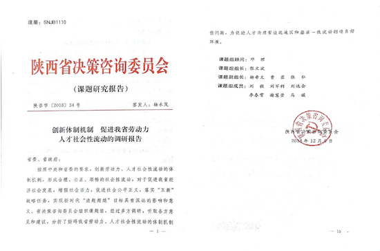 為此,陜西省決策咨詢委員會專門組織課題組進行了專題研究。經(jīng)過長達半年時間,多方調(diào)研,聽取各方意見和建議,數(shù)次修改,由我校經(jīng)管院劉毅博士主筆,李春霄博士參與撰寫的《創(chuàng)新體制機制 促進我省勞動力人才社會性流動的調(diào)研報告》,由陜西省決策咨詢委員會以決策咨詢報告的形式(陜咨字[2018]34號)報省委、省政府,得到省委、省政府的重視。