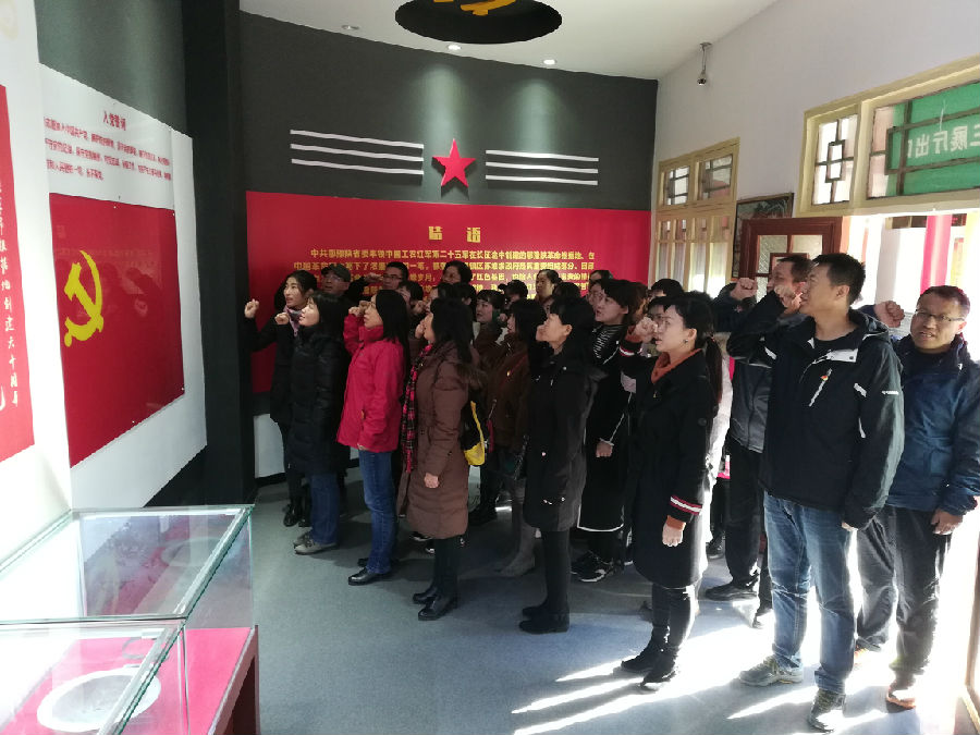 進入紀念館,各位黨員同志們認真地聽取了解說員的講解,了解到葛牌鎮(zhèn)區(qū)蘇維埃政府是在1935年二月初,由徐寶珊、吳煥先、程子華、徐海東等率領的中國工農(nóng)紅軍第二十五軍建立的。葛牌鎮(zhèn)區(qū)蘇維埃政府成立后,根據(jù)當?shù)厝罕姷膹娏乙?,?zhèn)壓土豪劣紳,打擊封建勢力,給群眾分田分地。為抗擊敵特勢力,建立紅色交通站和武裝赤衛(wèi)隊,開展游擊斗爭。參觀完紀念館,所有教工黨員再次重溫入黨誓詞,面對革命先烈的遺跡,進行了莊嚴地宣誓。