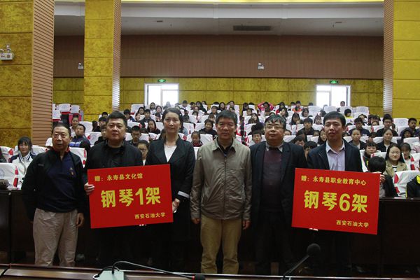 9月27日,冒著綿綿秋雨,校工會(huì)再次向永壽縣捐贈(zèng)鋼琴捐贈(zèng)。這次共向縣職教中心捐贈(zèng)鋼琴6架,向縣文化館捐贈(zèng)1架,至此,西安石油大學(xué)已向永壽捐贈(zèng)鋼琴14架。
