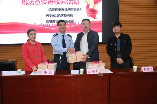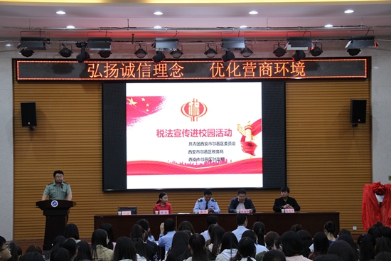 區(qū)稅務局總經濟師徐凱介紹由西安市團委、稅務局、財政局聯(lián)合發(fā)起的稅收宣傳進校園的活動概括,并宣傳從早抓起,在學生中倡導懂法、知法、守法、學法,鼓勵學生爭做稅收宣傳員。