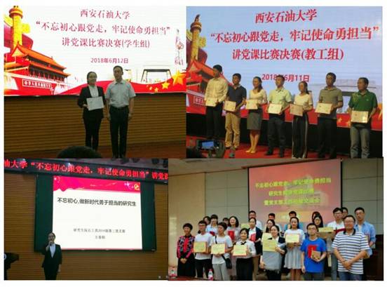 ——促進(jìn)工作,堅(jiān)持融合。在開展專題學(xué)習(xí)和落實(shí)三會(huì)一課制度中,研究生院黨委堅(jiān)持以促進(jìn)工作,學(xué)做融合為原則,要求研究生黨建工作為研究生學(xué)術(shù)實(shí)踐和穩(wěn)定安全教育提供思想保證和動(dòng)力支持。2018年5月至今,在各研究生黨支部積極帶動(dòng),研究生黨員模范帶頭下,研究生院超額完成互聯(lián)網(wǎng)+創(chuàng)新創(chuàng)業(yè)大賽報(bào)名工作,研究生在石油裝備創(chuàng)新設(shè)計(jì)大賽、研究生電子設(shè)計(jì)競(jìng)賽、陜西省研究生創(chuàng)新成果展報(bào)名積極,并石油工程設(shè)計(jì)大賽等學(xué)科競(jìng)賽中獲得全國(guó)二等獎(jiǎng)2項(xiàng)、三等獎(jiǎng)3項(xiàng)。在穩(wěn)定安全教育中,充分發(fā)揮黨支部戰(zhàn)斗堡壘作用和研究生黨團(tuán)骨干作用,結(jié)合研究生在學(xué)習(xí)生活中關(guān)注的熱點(diǎn)難點(diǎn),開展研究生宿舍管理服務(wù)專題座談會(huì);結(jié)合“525心理健康教育月”,開展宣傳倡議、印發(fā)手冊(cè)、現(xiàn)場(chǎng)咨詢、科普展覽、電影評(píng)析、問卷調(diào)查、主題講座等系列活動(dòng);結(jié)合畢業(yè)生文明離校,開展畢業(yè)生初入職場(chǎng)系列講座、畢業(yè)籃球賽、畢業(yè)生黨員座談會(huì)、主題征文等,進(jìn)一步強(qiáng)化黨員身份意識(shí),宗旨意識(shí),切實(shí)增強(qiáng)黨員榮譽(yù)感,責(zé)任感,使命感,為進(jìn)一步加強(qiáng)研究生思想政治教育和積極推進(jìn)研究生黨建工作做出自身更大的貢獻(xiàn)。