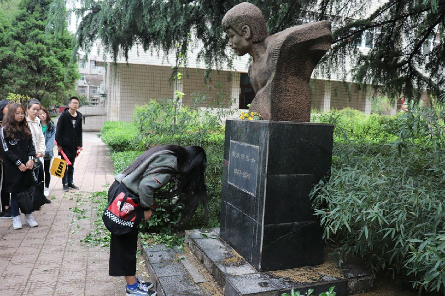 離開烈士陵園后,大家步行至我校雁塔校區(qū),在烈士唐春雨和王進(jìn)喜的雕像前,行鞠躬禮,以表達(dá)崇敬和懷念之情。
