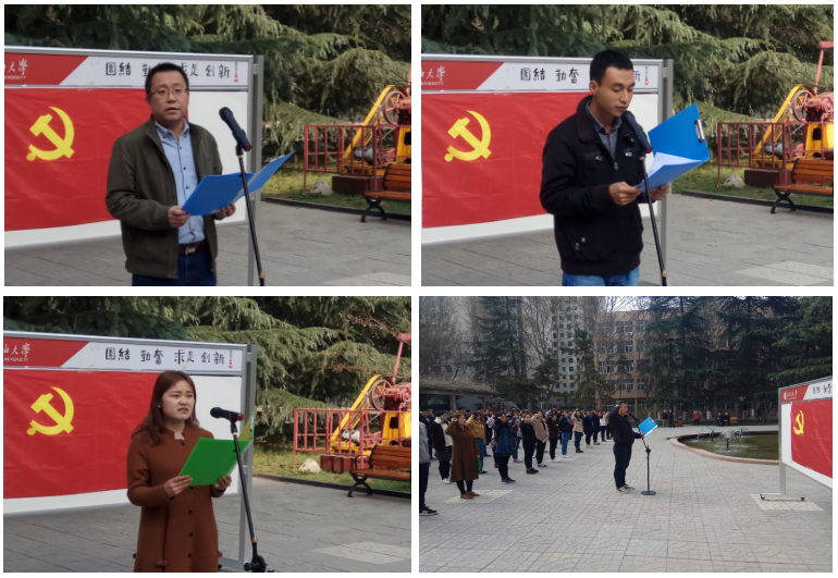 在雄壯的《國際歌》聲,石工類2016級(jí)第一黨支部何接宣布宣誓儀式正式開始。110名新黨員面向黨旗,舉起右手,在領(lǐng)誓人研究生院機(jī)械類2016級(jí)第一黨支部趙華東的逐句領(lǐng)讀下,用慷慨激昂的語氣,莊嚴(yán)向黨旗宣誓,表達(dá)對(duì)黨的忠誠、為共產(chǎn)主義事業(yè)奮斗終身的決心。其他參會(huì)人員與新黨員一同宣誓,重溫入黨誓詞。新黨員代表研究生院石工類2015級(jí)第一黨支部劉夢(mèng)文同學(xué)作了表態(tài)發(fā)言,結(jié)合研究生日常學(xué)習(xí)工作生活,談了一名共產(chǎn)黨員的擔(dān)當(dāng)和責(zé)任,表明了自己投身黨的事業(yè)的決心和勇氣。