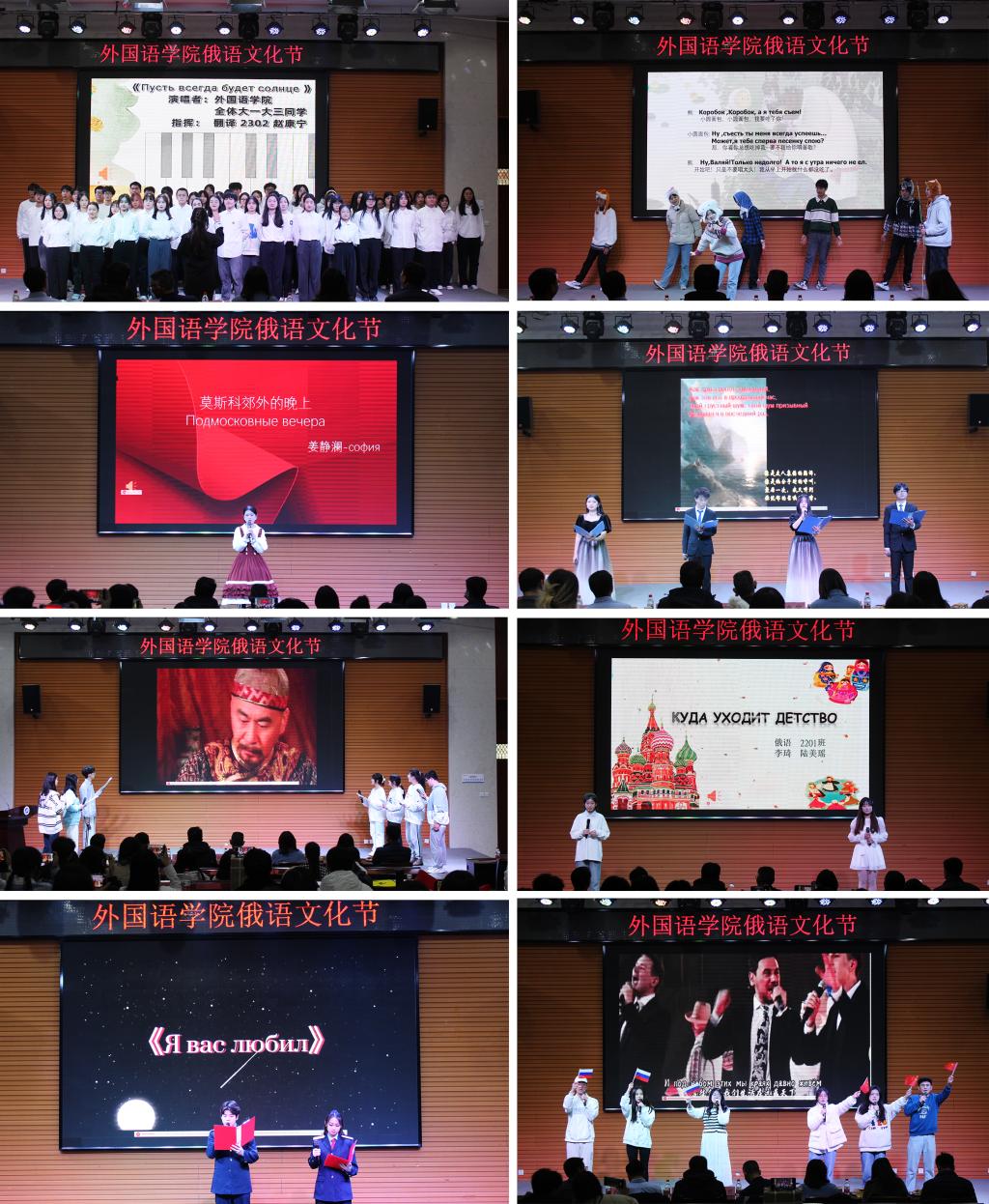 本屆俄語(yǔ)文化節(jié)由俄語(yǔ)歌曲串燒、普希金詩(shī)歌朗誦、俄語(yǔ)短劇表演、影視短劇翻譯配音表演以及外語(yǔ)書(shū)法大賽等環(huán)節(jié)組成?;顒?dòng)現(xiàn)場(chǎng)熱鬧非凡,節(jié)目題材豐富、精彩紛呈,有機(jī)融合了中國(guó)和俄羅斯文化元素。俄語(yǔ)專(zhuān)業(yè)學(xué)生用明快、激昂的大合唱拉開(kāi)了俄語(yǔ)文化節(jié)的序幕;詩(shī)朗誦《致大?!?,讓大家感受到普希金追求光明、謳歌自由的思想情感;話劇《小圓面包》,用可愛(ài)豐富的肢體語(yǔ)言和流利的口語(yǔ)表現(xiàn)出學(xué)生良好的俄語(yǔ)語(yǔ)言功底;翻譯配音影視劇片段《甄嬛傳》和《功夫熊貓》將活動(dòng)氣氛推向高潮;俄語(yǔ)歌曲串燒《幸福鳥(niǎo)》、《莫斯科郊外的晚上》、《致青春》唱出了俄語(yǔ)專(zhuān)業(yè)學(xué)生朝氣蓬勃的精神風(fēng)貌;由西安鐵路職業(yè)技術(shù)學(xué)院的學(xué)生帶來(lái)的詩(shī)朗誦《我曾經(jīng)愛(ài)過(guò)你》以及俄語(yǔ)歌曲《小鬧鐘》讓大家眼前一亮;詩(shī)朗誦《假如生活欺騙了你》將普希金語(yǔ)言的魅力展露無(wú)遺;匯演在俄語(yǔ)專(zhuān)業(yè)2021級(jí)學(xué)生帶來(lái)的歌舞劇《冬日》中落下帷幕。