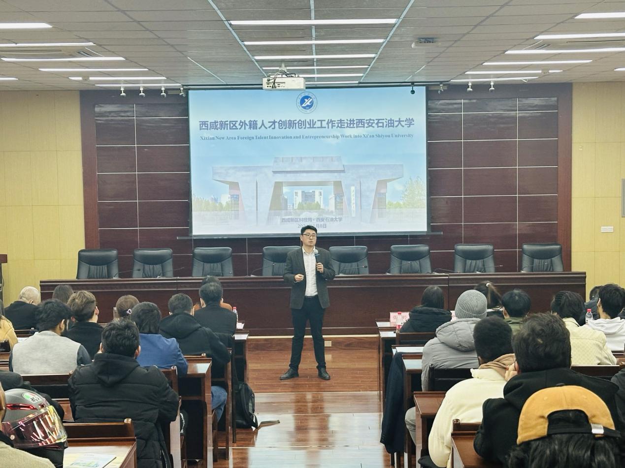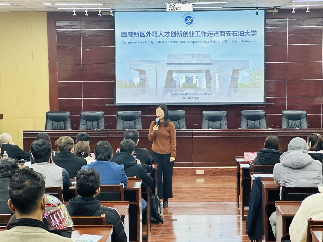 2024年1月8日下午,由國際教育學院聯(lián)合西咸新區(qū)科技局舉辦的, “西咸新區(qū)外籍人才創(chuàng)新創(chuàng)業(yè)工作走進西安石油大學”創(chuàng)新創(chuàng)業(yè)政策宣講會在雁塔校區(qū)會議中心第五會議室舉行。西安市科技局、西咸新區(qū)科技局、灃東新城秦創(chuàng)原科轉(zhuǎn)平臺等相關(guān)負責人,以及我校創(chuàng)新創(chuàng)業(yè)中心、國際交流與合作處、國際教育學院負責人參加宣講交流會,70余名在校留學生參加活動。