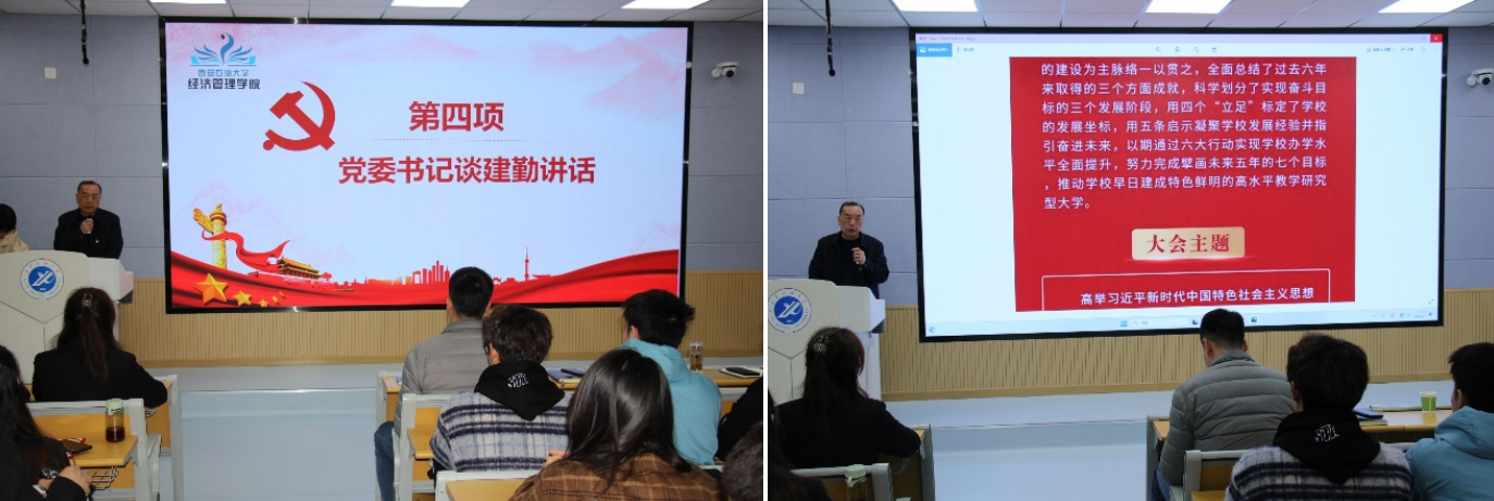 學院黨委書記談建勤對本次述職匯報進行點評總結。他對2023年學院學生黨建工作成果表示肯定,對辛勤付出的黨工辦全體成員表示感謝。他強調,學生黨建工作要始終堅持以習近平新時代中國特色社會主義思想為指導,堅持因時而化、因事而進、因勢而新,多措并舉創(chuàng)新工作方式方法,強化黨建品牌建設。他指出,提升黨建工作質量是落實“立德樹人”根本任務的重要舉措,增強黨務工作隊伍建設,有利于發(fā)揮黨建的示范引領作用。會上,他結合落實學校第三次黨代會精神為全體干部講授專題黨課。他指出,學校第三次黨代會是學校改革建設發(fā)展實現(xiàn)關鍵性跨越的一次重要會議,全面總結了學校過去六年來取得的成就,為學校未來發(fā)展凝聚了啟示經(jīng)驗、指明了奮進方向。他鼓勵大家要不斷提高政治站位,堅定理想信念、堅守初心使命,立志成才報國、恪守清正廉潔,奮勇爭先、不負韶華。他對大家提出四點要求和希望:一是在思想政治上要保持先進、保持敏銳、保持主動,充分發(fā)揮引領示范作用;二是在學風建設上要帶頭示范、鼓勁加油、督促幫扶,從點滴小事做起,不斷營造良好學風;三是在學術研討、社會實踐、社團建設、公益活動等方面要大膽探索、不斷創(chuàng)新,努力打造“博學多思、銳意進取、永爭第一”的經(jīng)管學生品牌;四是在品德修養(yǎng)上要砥礪不輟、躬行踐履,營造團結友愛的集體氛圍,強化道德修養(yǎng),形成崇德、爭優(yōu)、創(chuàng)優(yōu)的良好氛圍。