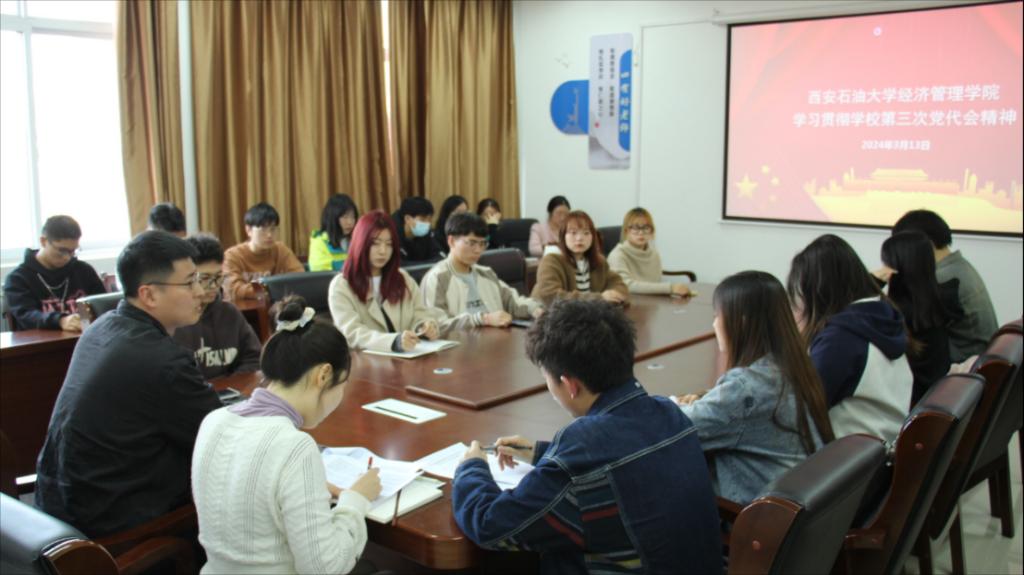 為進(jìn)一步加強(qiáng)團(tuán)學(xué)干部思想政治建設(shè),提升理論水平,深入學(xué)習(xí)貫徹2024年全國兩會(huì)精神與學(xué)校第三次黨代會(huì)精神,經(jīng)濟(jì)管理學(xué)院于3月13日下午在鄠邑校區(qū)崇文樓305會(huì)議室舉辦團(tuán)學(xué)干部學(xué)習(xí)交流分享會(huì)。經(jīng)濟(jì)管理學(xué)院團(tuán)委書記李博文、團(tuán)學(xué)指導(dǎo)老師任仰及主要團(tuán)學(xué)工作干部參加本次活動(dòng)。