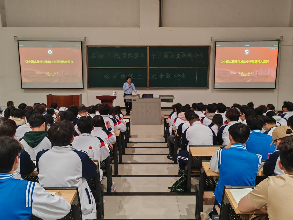 3月14日晚19:00,石油工程學院第三十二期入黨積極分子培訓班第二講在石工地科樓115教室順利進行。西安石油大學學生工作部(處)部(處)長、就業(yè)指導中心主任王亮作了題為“以中國式現(xiàn)代化推動中華民族偉大復興”的黨課培訓。本次黨課線上線下同步進行,石油工程學院共計200余名參訓學員參加了此次培訓。