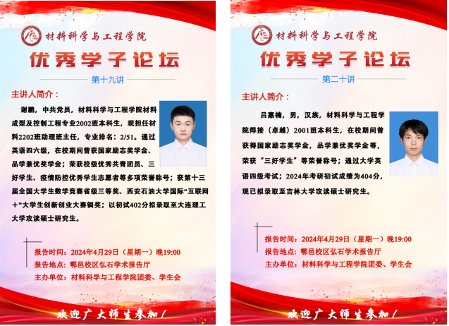 為充分發(fā)揮優(yōu)秀大學(xué)生的朋輩榜樣作用,營造見賢思齊良好學(xué)習(xí)風(fēng)氣向廣大備考學(xué)子提供寶貴的經(jīng)驗借鑒,幫助學(xué)生更好地規(guī)劃考研之路。429日晚,材料科學(xué)與工程學(xué)院在鄠邑校區(qū)圖書館弘石學(xué)術(shù)報告廳舉辦優(yōu)秀學(xué)子論壇第十講和第二十講,本期邀請到的優(yōu)秀學(xué)子是我院材料成型及控制工程專業(yè)謝鵬同學(xué),目前以初試402分?jǐn)M錄取至大連理工大學(xué)攻讀碩士研究生;焊接技術(shù)與工程專業(yè)(卓越班)呂嘉楠同學(xué),以初試404分?jǐn)M錄取至吉林大學(xué)攻讀碩士研究生。學(xué)院300余名本科生參加論壇。