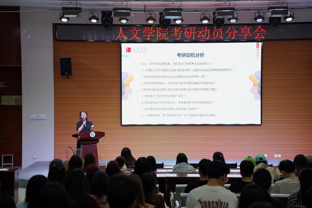 首先,副書記盛丹結(jié)合往年的考研形勢、錄取調(diào)劑情況和院校選擇等數(shù)據(jù),進行深入分析,詳細介紹了人文學院的碩士學科設(shè)置,并提出了三點建議,一是要選擇合適的目標院校,堅守考研初心,基于自身興趣、能力、學業(yè)成績和綜合素質(zhì)做出明智的選擇;二是要持之以恒,堅定考研信心,制定合理的備考計劃,保持積極向上的心態(tài),勇于面對挑戰(zhàn);三是要保持良好的生活習慣,規(guī)律作息、合理飲食和適量運動,學會調(diào)整心態(tài),遇到困難時積極尋求幫助和支持。