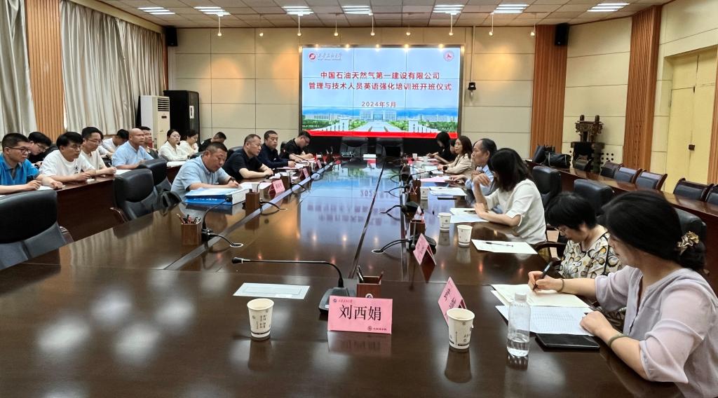 5月17日上午,外國語學(xué)院在雁塔校區(qū)會議中心第二會議室舉行了中國石油天然氣第一建設(shè)有限公司“國際合作工程技術(shù)與管理人員英語強化培訓(xùn)班”開班儀式。中國石油天然氣第一建設(shè)有限公司第五分公司經(jīng)理常曉鋒、總經(jīng)濟師汪洋、學(xué)院黨委書記田虹霞、副院長劉輝、MTI中心主任袁森、部分任課教師及全體培訓(xùn)學(xué)員參加。