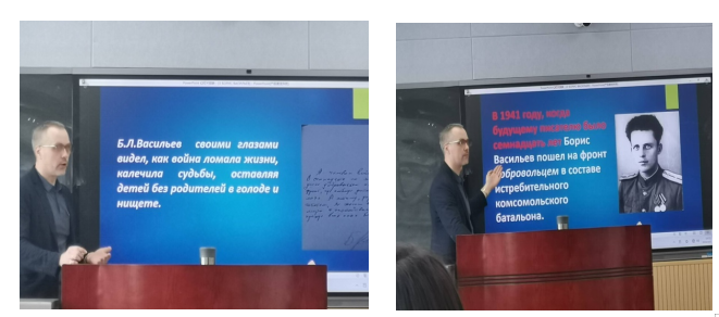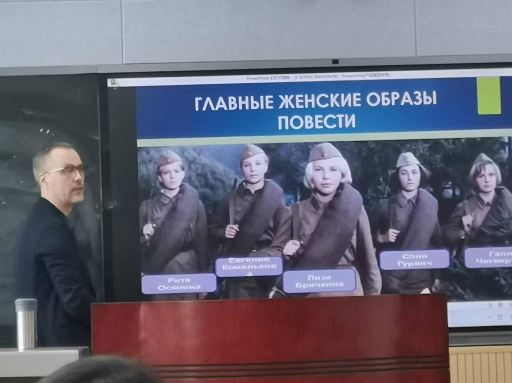講座中,德米特里以生動(dòng)的語(yǔ)言和豐富的知識(shí),向?qū)W生們介紹了鮑里斯·利沃維奇·瓦西里耶夫的生平經(jīng)歷、文學(xué)成就,以及其代表作的主題和意義。主講人重點(diǎn)分析了作家的成名作《未列入名冊(cè)》和《這里的黎明靜悄悄》。借助視頻和圖片,德米特里幫助學(xué)生們更加直觀地感受到作品中所描繪的場(chǎng)景和人物形象,加深了他們對(duì)瓦西里耶夫文學(xué)世界的認(rèn)識(shí)和理解,了解戰(zhàn)爭(zhēng)的殘酷和蘇聯(lián)人民的英勇。分析作品時(shí)德米特里圍繞小說(shuō)中的人物和故事情節(jié),與學(xué)生展開(kāi)問(wèn)答互動(dòng),同學(xué)們的爭(zhēng)相回答令現(xiàn)場(chǎng)氣氛變得活躍而熱烈。