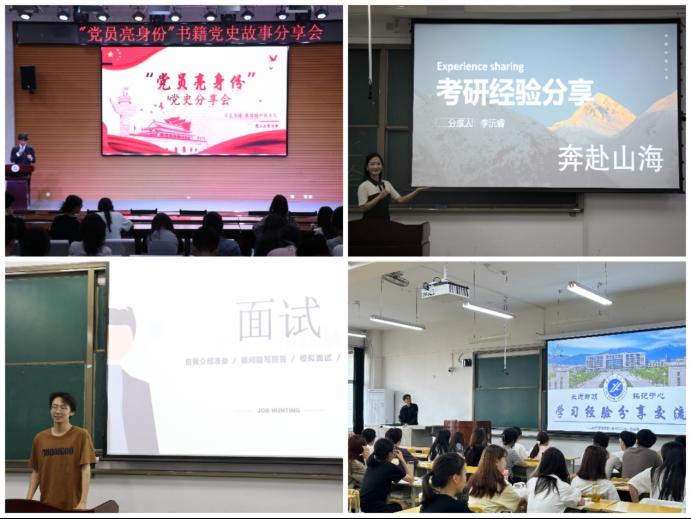 注重示范引領,強化經(jīng)驗分享“優(yōu)氛圍”。學院深入開展培塑先進典型和經(jīng)驗分享活動,建立健全朋輩幫扶制度,引導學生自我管理、自我服務、自我教育、自我監(jiān)督,形成比、學、趕、幫、超良好氛圍。5月6日至15日,學院舉辦學習經(jīng)驗分享交流會,范瑞寶、徐顧銘等學生代表就學習計劃、課堂筆記、復習鞏固、資源利用等方面進行了經(jīng)驗分享。10日至18日,各學生黨支部開展黨員亮身份系列活動,組織“聆聽歷史,傳承榮光”黨史故事和紅色書籍閱讀分享會,學生黨支部周昱竹、錢靜宜、王安玉、辛蕓菲等同學開展多場分享活動,激發(fā)了廣大學生愛黨愛國、向上向善的奮進力量,開展黨員“朋輩幫扶,團結互助”活動,積極幫助身邊同學學習,主動宣傳優(yōu)秀共產(chǎn)黨員的模范事跡。30日,舉辦畢業(yè)季“優(yōu)秀學子”報告會,學院“就業(yè)先鋒”金麗紅、邵金龍等6位同學就自我認知、簡歷設計、投遞技巧、面試心得等方面分享了求職就業(yè)經(jīng)驗。朱琪、王澤基等4位升學同學從不同角度分享了國內(nèi)外升學的要點與訣竅,對資料的準備和方法以及對如何擇校進行了具體介紹,幫助低年級同學對升學和考研有了更深入的了解。