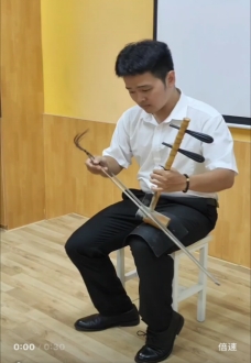 京胡《京郊行》,演奏者以嫻熟精湛的演奏技巧,帶動一位現(xiàn)場聆聽的小男孩,不自覺的隨著樂曲的高潮,臉上流露出充滿笑意的表情。