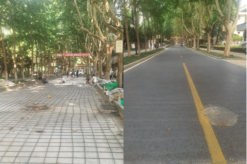 4.雁塔校區(qū)主干道路改造。雁塔校區(qū)主干道路面出現(xiàn)局部沉降、開(kāi)裂,為保證行車(chē)安全。暑假期間,后勤處聯(lián)系海綿工程項(xiàng)目部對(duì)有問(wèn)題的路面進(jìn)行維修加固。本次海綿項(xiàng)目部維修加固路面約700平方米。