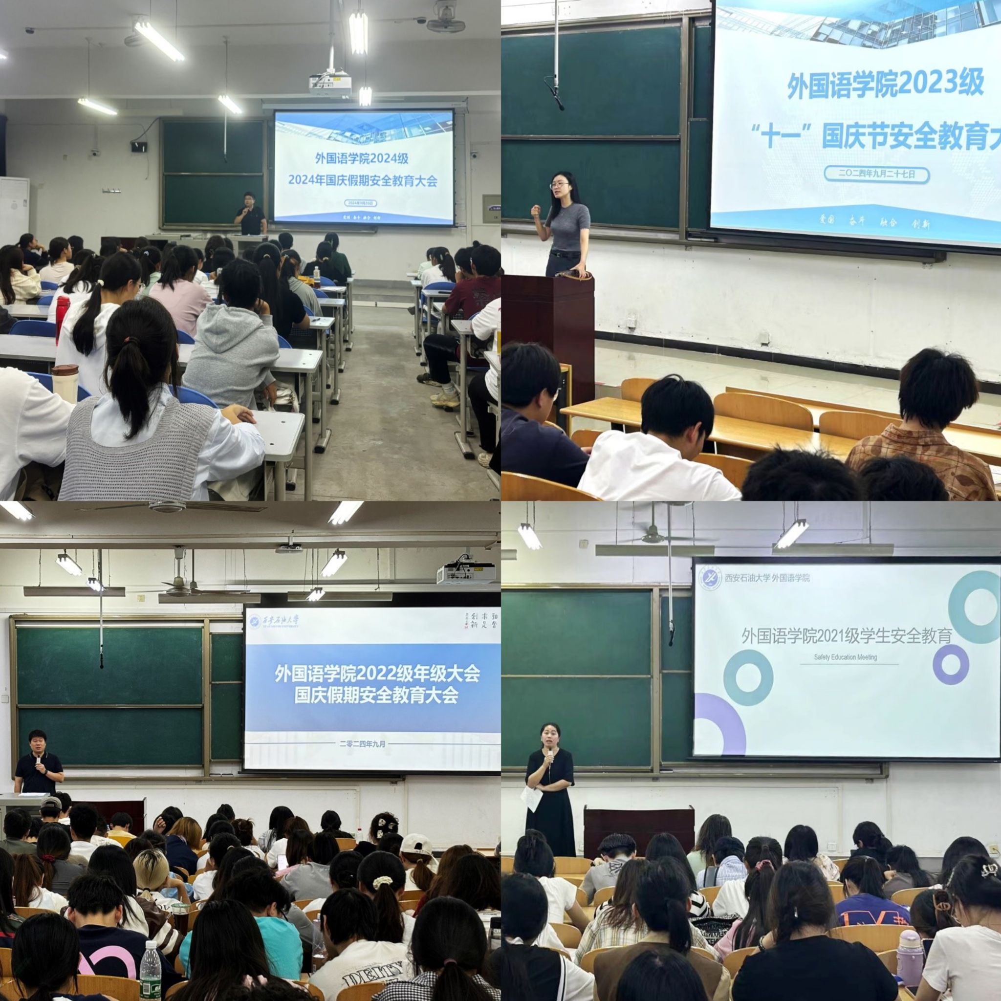為提高學(xué)生安全意識(shí),筑牢安全防線,落實(shí)學(xué)校和學(xué)院相關(guān)工作安排部署。近期,外國(guó)語(yǔ)學(xué)院各年級(jí)在鄠邑校區(qū)A316、A309、B121、B123、B112分別召開國(guó)慶節(jié)假期安全教育大會(huì)。