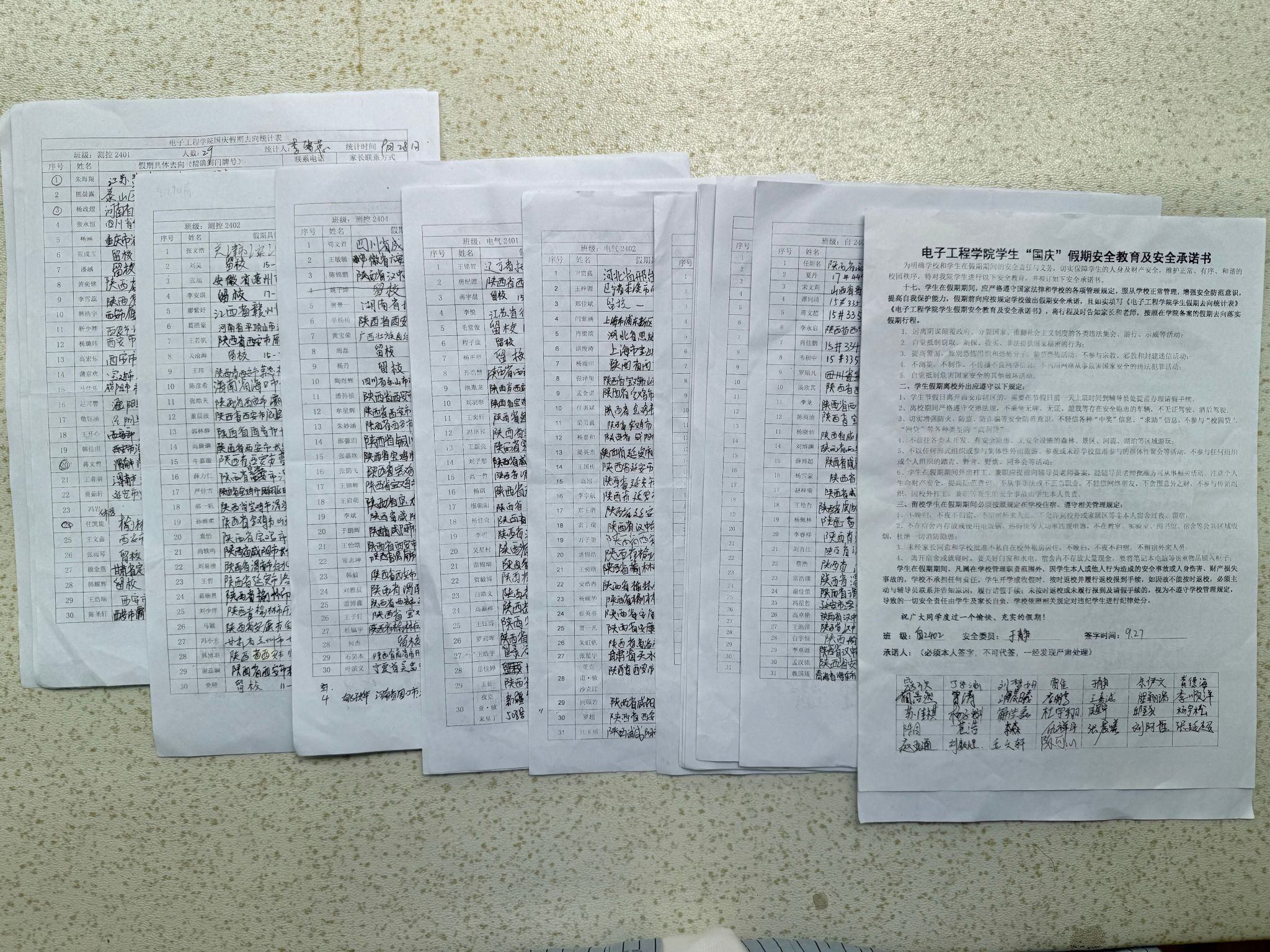 會后,各年級組織簽署了《電子工程學(xué)院學(xué)生2024年國慶假期安全責(zé)任承諾書》和《電子工程學(xué)院學(xué)生2024年國慶假期去向統(tǒng)計表》。
