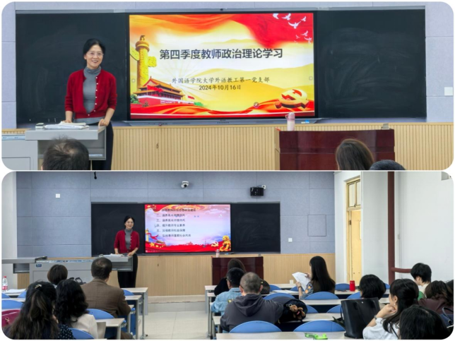 10月16日下午,外國語學院大學外語第一教學部全體教師在鄠邑校區(qū)A209教室召開“第四季度教師政治理論學習”擴大會議暨系部期中教學工作會。會議由黨支部書記付俊芳主持,大學外語第一教學部全體教師參加。