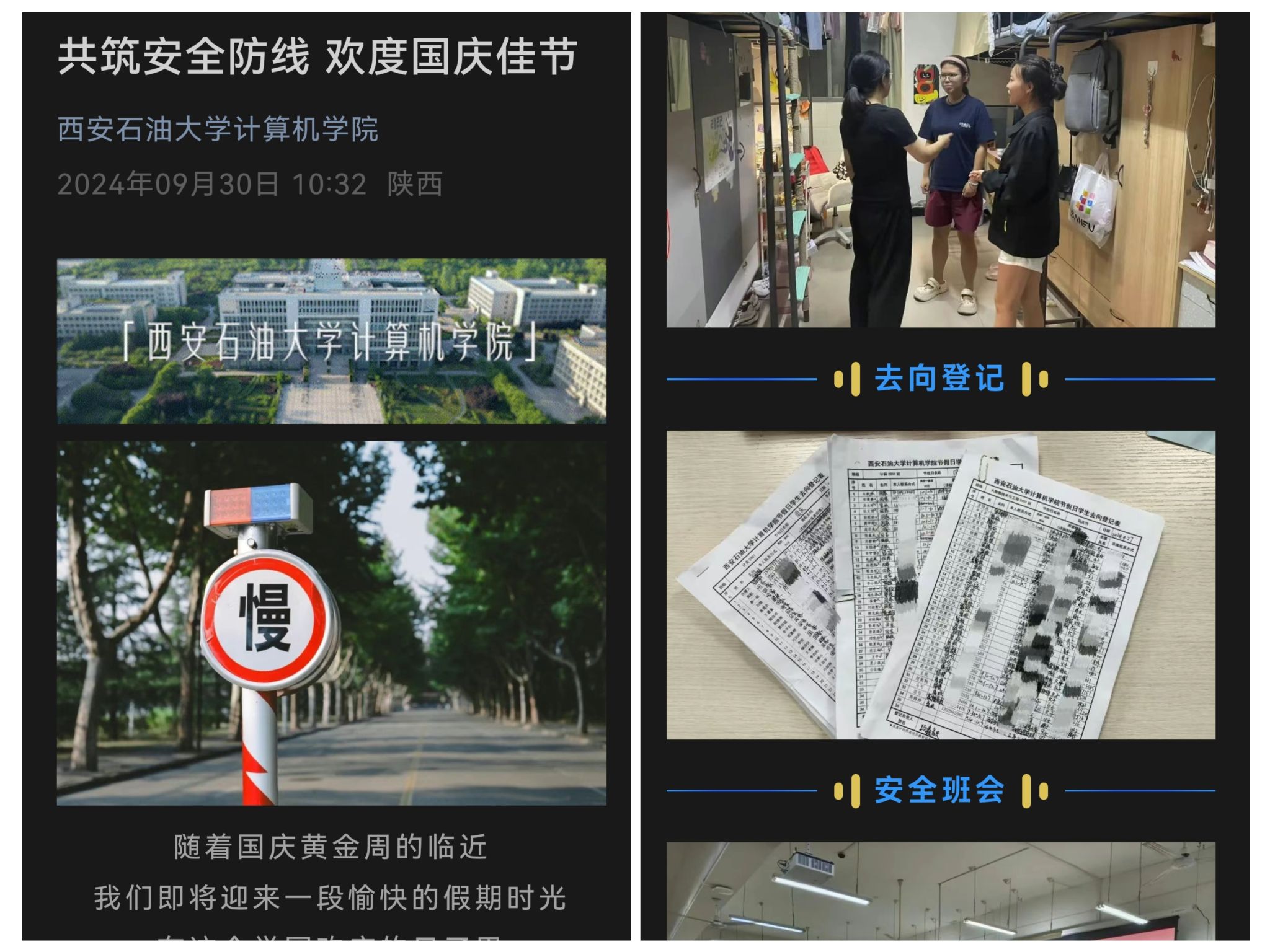 一是在國慶節(jié)前夕,學(xué)院通過公眾號推送《共筑安全防線 歡度國慶佳節(jié)》微信推文,各年級通過召開年級大會、走訪學(xué)生宿舍、假期去向登記、安全主題班會、假期出行安全小貼士等方式,引導(dǎo)同學(xué)們做好自己安全的第一責任人,確保自身健康安全和學(xué)校的和諧穩(wěn)定。