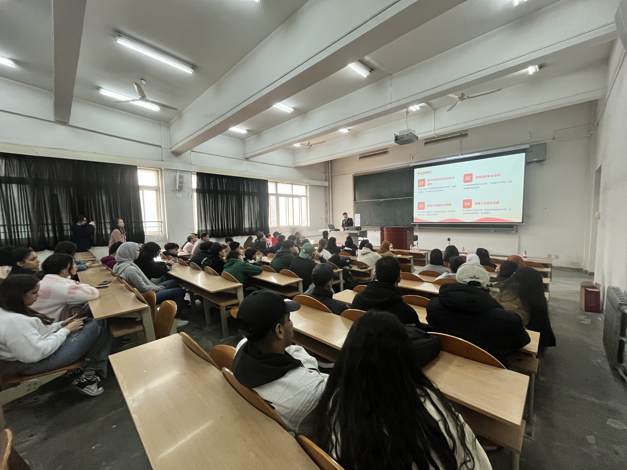 11月7日下午,國際教育學院舉辦2024年“119”消防安全月主題活動-國際學生消防安全知識宣講會及消防演練。活動在明德校區(qū)舉行,西安市公安局文保支隊民警許英杰、東儀路派出所民警原緒軍、董鍇、北京衛(wèi)民安消防宣教中心陜西站教官王浩淳、校保衛(wèi)處李慶奎、郭宸青和近百名國際學生參加了此次活動。