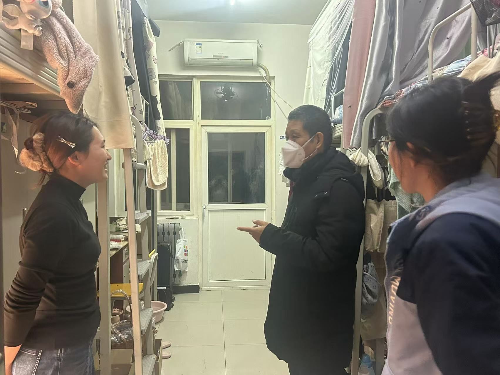 走訪過程中,袁通路與同學們進行了親切的交談,詳細了解了學生的學習和生活情況,全面排查了學生的宿舍安全隱患,認真聽取了學生的各項訴求,鼓勵同學們認真學習、快樂生活、積極上進、不斷向前。