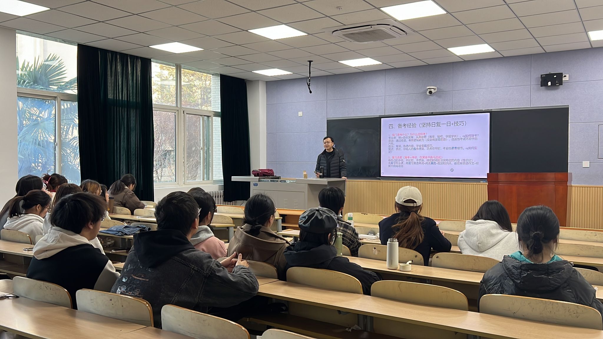 靜老師圍繞考研的關(guān)鍵要素進行了深入分享。在考研流程方面,詳細介紹了院校專業(yè)選擇、報名注意事項,初試、復(fù)試的環(huán)節(jié)及時間節(jié)點,使同學(xué)們對考研的整體框架有了清晰的認識。之后,靜老師結(jié)合自身學(xué)習(xí)經(jīng)驗,給同學(xué)們分享復(fù)習(xí)背誦技巧,為同學(xué)們提供了系統(tǒng)且實用的方法,強調(diào)理解記憶與重復(fù)記憶相結(jié)合,通過構(gòu)建知識框架、巧用記憶卡片等方式提高背誦效率。此外,靜老師還著重強調(diào)了合理安排復(fù)習(xí)時間的重要性,建議同學(xué)們制定科學(xué)的學(xué)習(xí)計劃,平衡好各科目的復(fù)習(xí)進度,避免前期松懈、后期緊張的情況出現(xiàn),同時也要注意勞逸結(jié)合,保持良好的學(xué)習(xí)狀態(tài)。