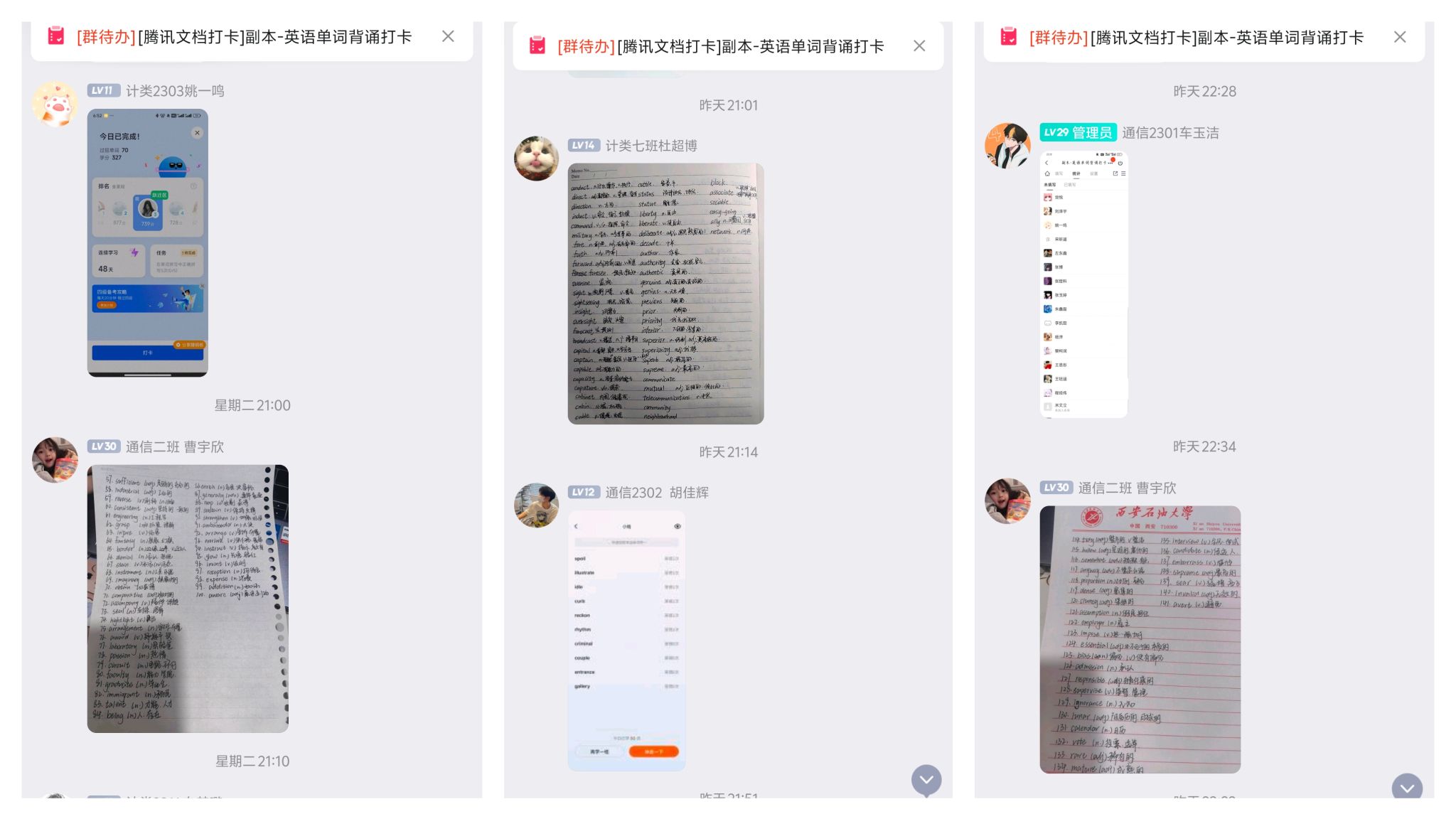 英語四級考試,單詞是基本功。為了夯實備考學(xué)生的單詞基本功,學(xué)院分年級組織學(xué)生開展“每日英語單詞背誦打卡”活動,將學(xué)生喜聞樂見的“打卡”方式與每日英語學(xué)習(xí)有效結(jié)合,變“單兵作戰(zhàn)”為“集體同頻”,有效增強(qiáng)了學(xué)生堅持的能動性和學(xué)習(xí)的主動性。
