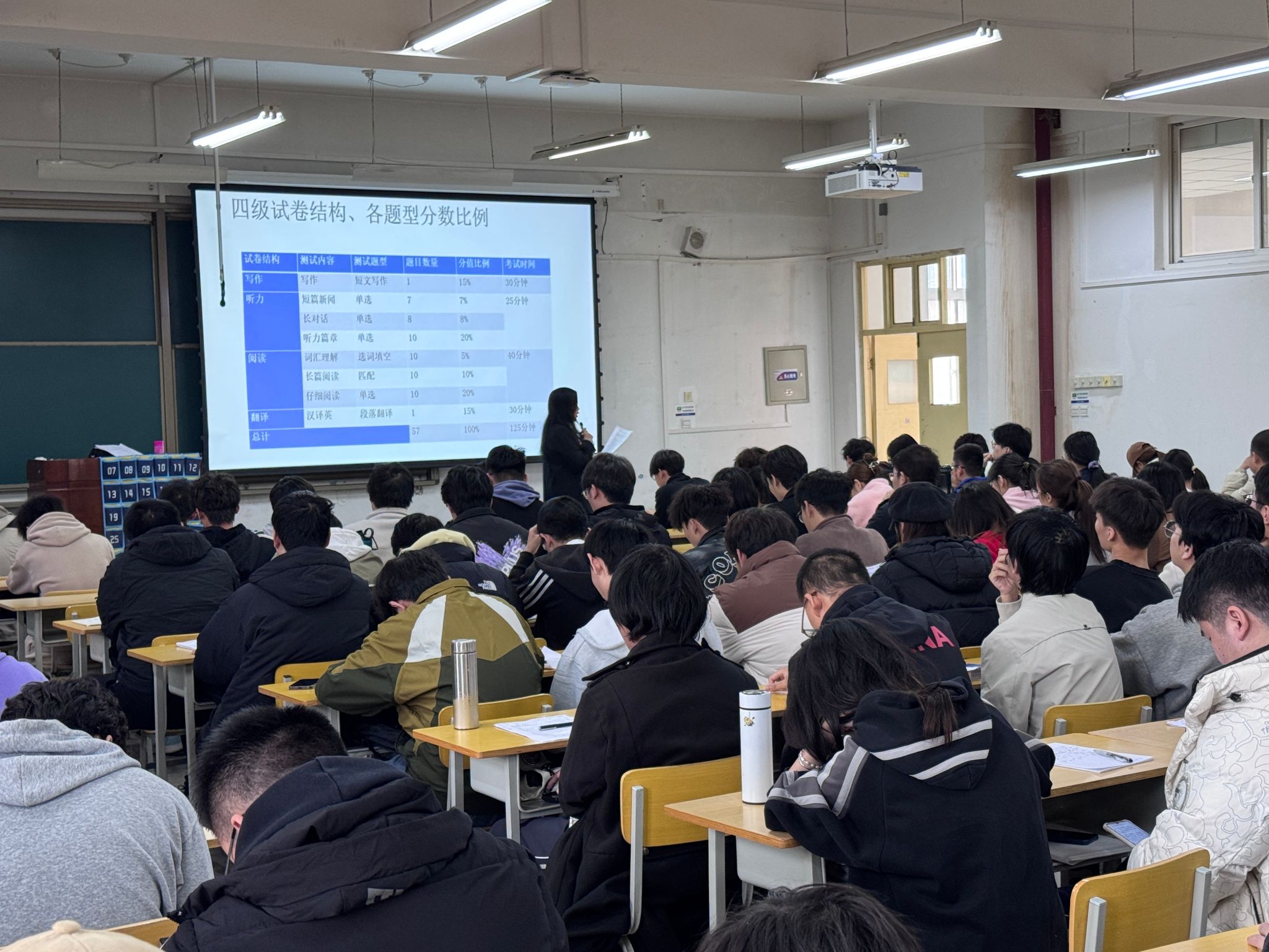學(xué)院邀請外國語學(xué)院張磊、蔡曉青兩位專業(yè)老師,從11月19日開始,采用“模擬考試+試題解析”的方式系統(tǒng)講授往年四級考試真題或模擬題,學(xué)院2022級、2023級310名本科生分兩個大教室參加四級系列輔導(dǎo)。將“專家老師”的專業(yè)優(yōu)勢和“精準(zhǔn)打靶”的目標(biāo)優(yōu)勢相結(jié)合,在為期一個月的系統(tǒng)學(xué)習(xí)中,有效提高學(xué)生應(yīng)試能力。