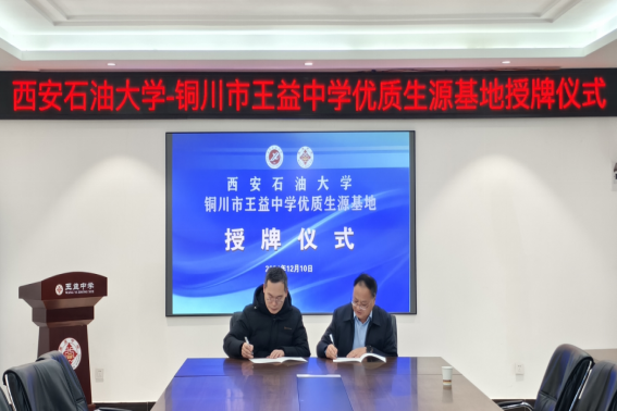會上,張建高代表學(xué)校與銅川王益中學(xué)簽署了《西安石油大學(xué)優(yōu)秀生源基地建設(shè)協(xié)議》,授予“優(yōu)秀生源基地”牌匾,贈送錄取喜報。