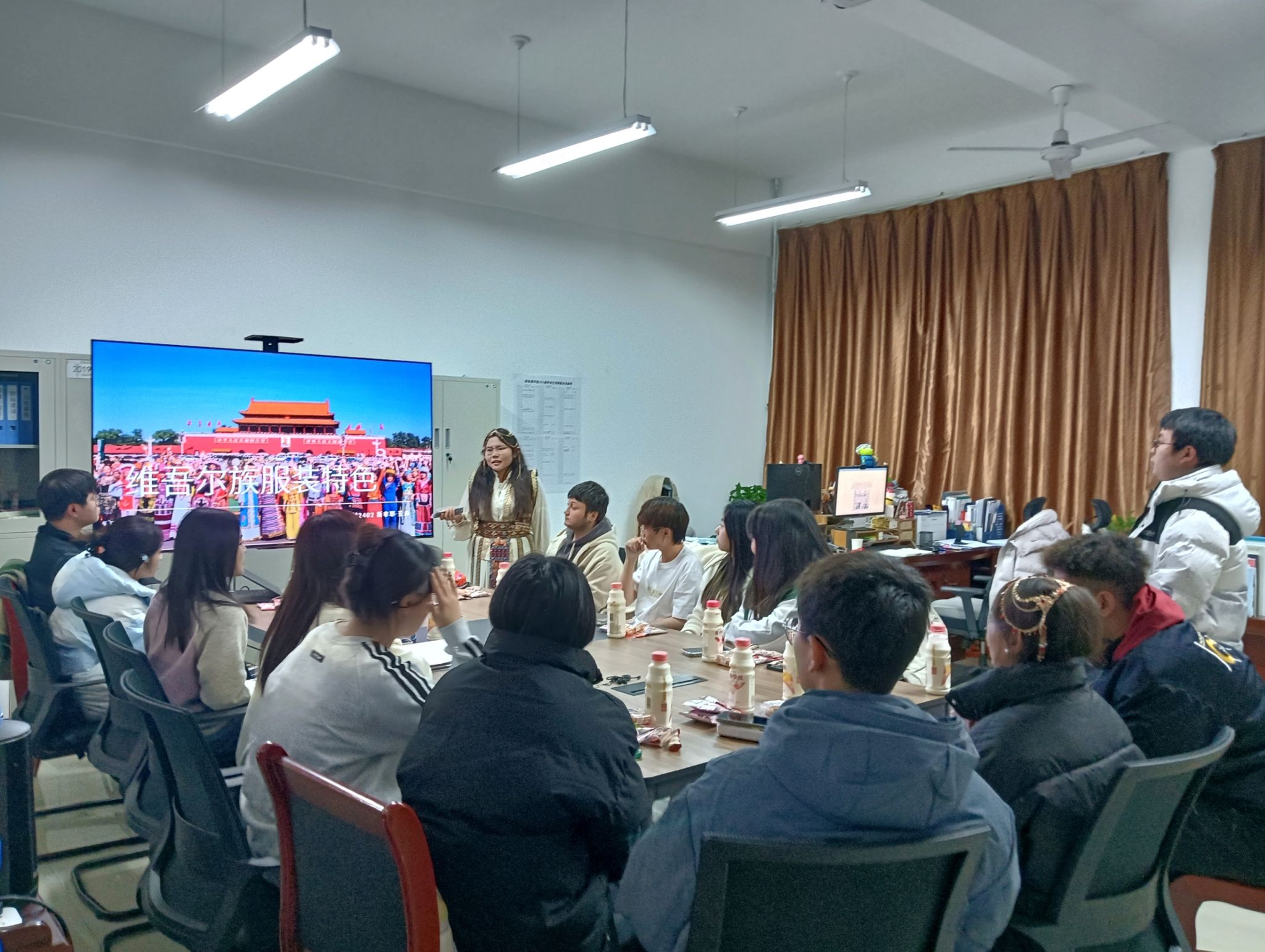 自我介紹環(huán)節(jié):搭建初步了解橋梁?;顒?dòng)伊始,來自不同年級(jí)的少數(shù)民族學(xué)生代表依次用普通話或本民族語言介紹了自己的姓名、所在班級(jí)以及所屬民族。這一環(huán)節(jié)不僅讓與會(huì)師生對(duì)彼此有了初步的了解,也營(yíng)造出了輕松愉快的氛圍,為后續(xù)的交流活動(dòng)打下了良好的基礎(chǔ)。民族服飾展示:領(lǐng)略獨(dú)特民族風(fēng)情。來自維吾爾族的斯非耶·亞森同學(xué)身著自己精心準(zhǔn)備的民族服飾,結(jié)合PPT向在場(chǎng)師生展示了維吾爾族服飾的獨(dú)特魅力。她詳細(xì)介紹了服飾的款式、顏色、圖案以及背后的文化寓意,使大家對(duì)維吾爾族的服飾文化有了更加直觀和深入的認(rèn)識(shí)。民族歌舞表演:展現(xiàn)多元文化風(fēng)采。斯非耶·亞森和熱比耶·穆合塔爾兩位維吾爾族同學(xué)為大家?guī)砹恕缎陆忚K舞》,她們舞姿優(yōu)美,節(jié)奏明快,充分展現(xiàn)了維吾爾族舞蹈的活潑與熱情。土家族同學(xué)袁子淳和向云騫則分別演唱了《六口茶》和《普通朋友》兩首歌曲,歌聲悠揚(yáng),情感真摯,讓在場(chǎng)師生感受到了土家族和流行音樂結(jié)合的獨(dú)特韻味。滿族同學(xué)于秋媛則帶來了《如愿》這首歌曲,她的演唱深情而富有感染力,贏得了大家的陣陣掌聲。