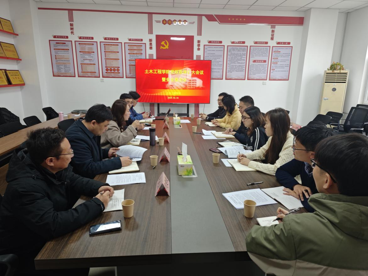 為全面貫徹省、校關(guān)于穩(wěn)定安全工作的相關(guān)文件要求,嚴(yán)格落實在2025年春季開學(xué)檢查工作中常江書記的指示,進一步加強學(xué)院內(nèi)部管理,確保學(xué)院各項工作平穩(wěn)有序開展,2月24日上午,土木工程學(xué)院在鄠邑校區(qū)開物樓135召開了黨政聯(lián)席擴大會暨安全穩(wěn)定工作會。院領(lǐng)導(dǎo)班子全體成員、工會主席、各辦公室負責(zé)人和全體輔導(dǎo)員參加會議,會議由學(xué)院黨委書記賈莉娜主持。