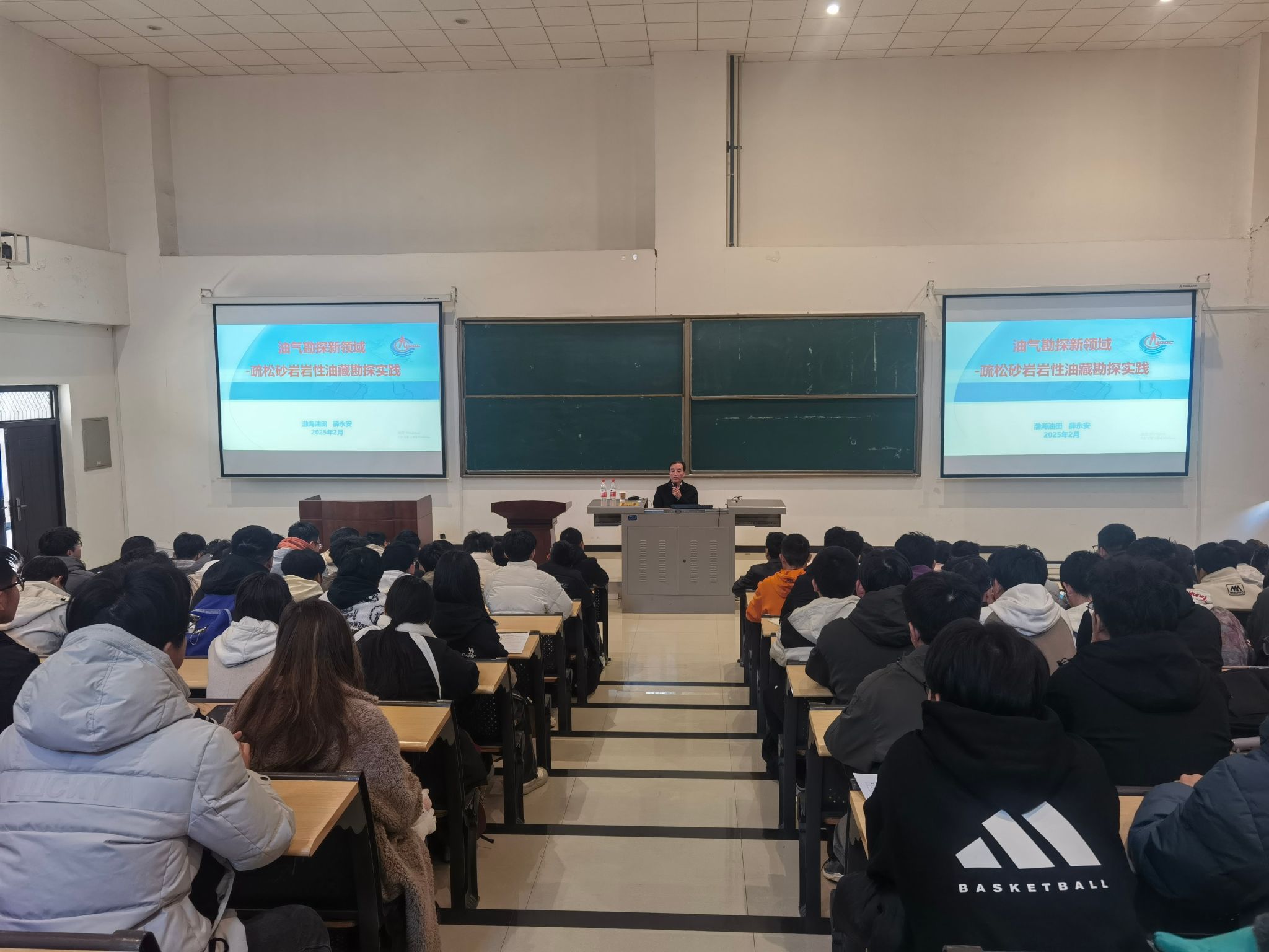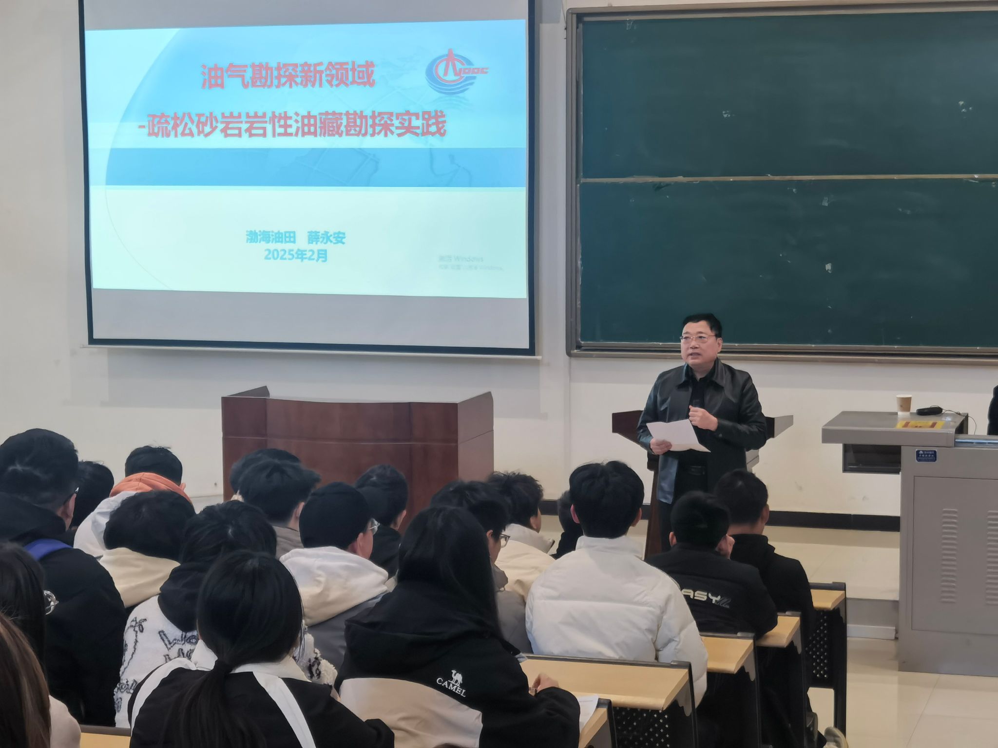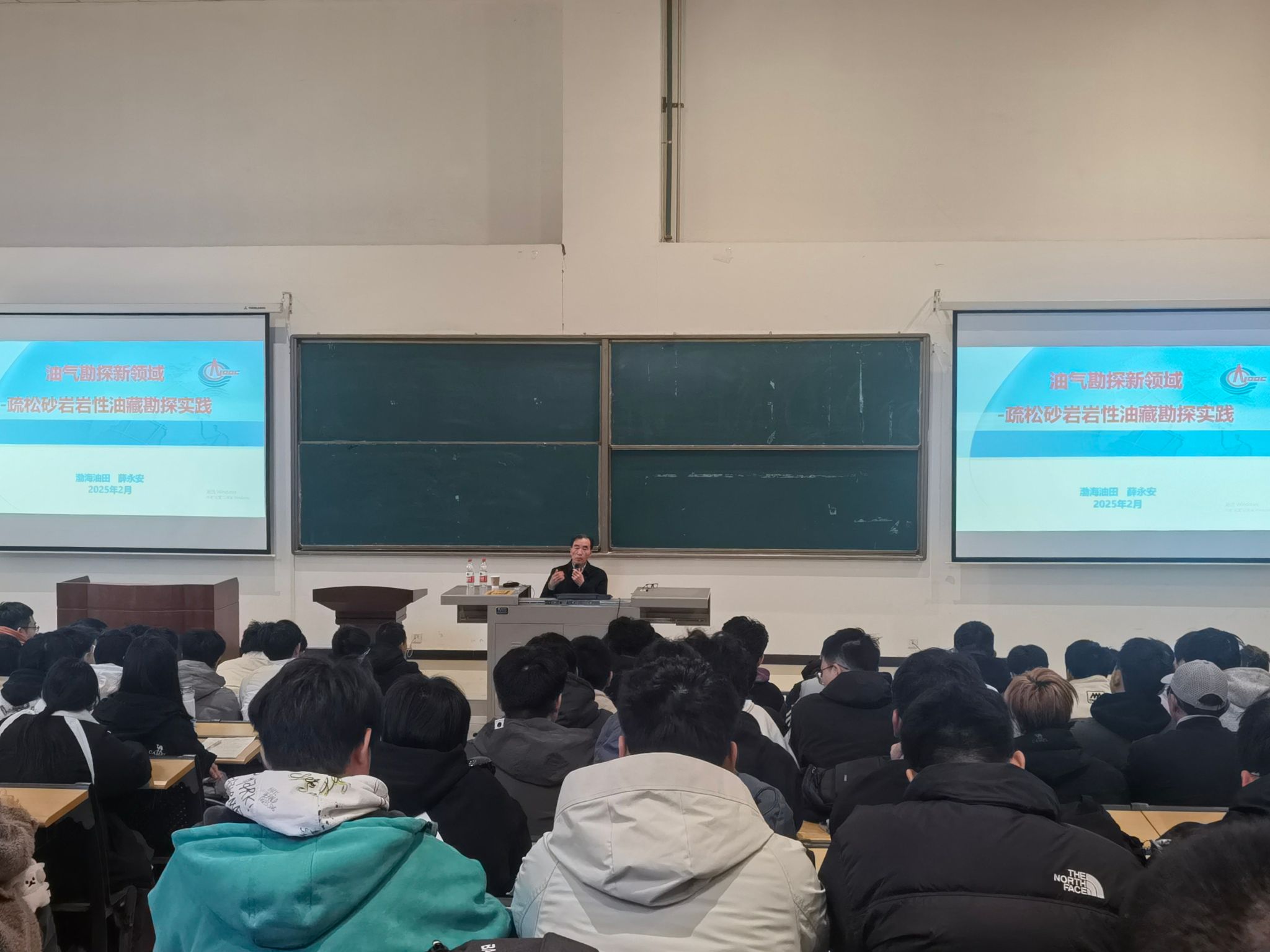 薛永安教授首先分享了自己近40年的油氣地質科研經驗,而后以渤海油田源外構造空白區(qū)新生界疏松砂巖巖性油藏勘探重大突破及系列理論創(chuàng)新為切入點,鼓勵同學們在學習中秉承腳踏實地、大膽假設、小心求證的原則,守正創(chuàng)新,努力成為未來我國能源領域頂得上、接得住的中堅力量。講座現(xiàn)場氣氛熱烈。