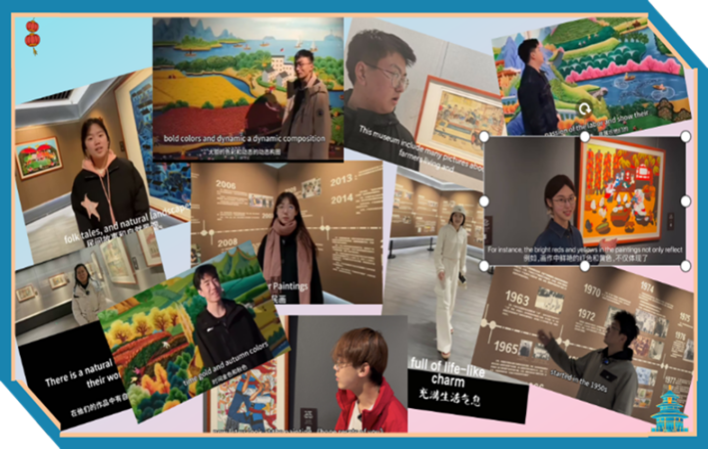 鄠邑農(nóng)民畫作為國家級非物質(zhì)文化遺產(chǎn),以原生態(tài)的鄉(xiāng)土題材、明快的色彩語言和質(zhì)樸的美學(xué)風(fēng)格蜚聲海內(nèi)外?;顒右潦迹瑢W(xué)生通過鄠邑區(qū)農(nóng)民畫博物館專業(yè)講解員的講解和視頻觀看,系統(tǒng)學(xué)習(xí)了農(nóng)民畫六十余年的發(fā)展歷程,深刻理解了鄠邑農(nóng)民畫作品中蘊含的關(guān)中民俗、節(jié)慶文化與農(nóng)耕智慧。在隨后的實踐環(huán)節(jié)中,學(xué)生以小組為單位,結(jié)合英語語言優(yōu)勢與新媒體技術(shù)展開創(chuàng)作,進(jìn)行英文講解以及視頻拍攝工作。為了提升視頻質(zhì)量,活動開展前,除了對英文腳本反復(fù)修改,很多學(xué)生還自學(xué)了一些攝影技術(shù)并進(jìn)行分鏡腳本設(shè)計?;顒蝇F(xiàn)場,學(xué)生手持設(shè)備,穿梭于展廳進(jìn)行多角度講解拍攝。