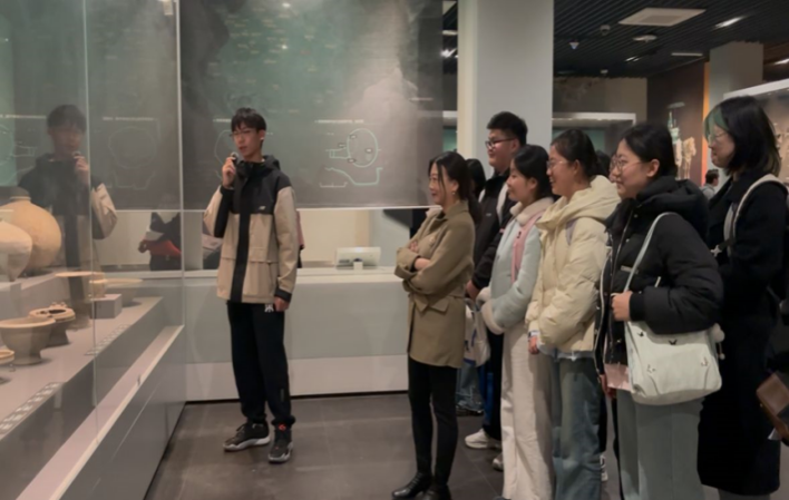 西安博物院是一座集文物收藏、科學(xué)研究、社會教育、園林休閑為一體的綜合性博物館。博物館內(nèi)藏品豐富,涵蓋了從遠(yuǎn)古時期到近現(xiàn)代的歷史文物,是了解西安乃至陜西歷史文化的重要窗口?;顒赢?dāng)天,“英銳實踐團(tuán)”成員在博物館工作人員的帶領(lǐng)下,對漢代玉杯、金背瑞獸葡萄鏡、秦代玉高足杯等文物進(jìn)行英文講解,了解了西安作為十三朝古都的輝煌歷史和文化底蘊。此次活動旨在通過參觀博物院,提升學(xué)生的英語表達(dá)能力,加深對中華優(yōu)秀傳統(tǒng)文化的理解與傳承,同時助力中華文化的國際傳播。
