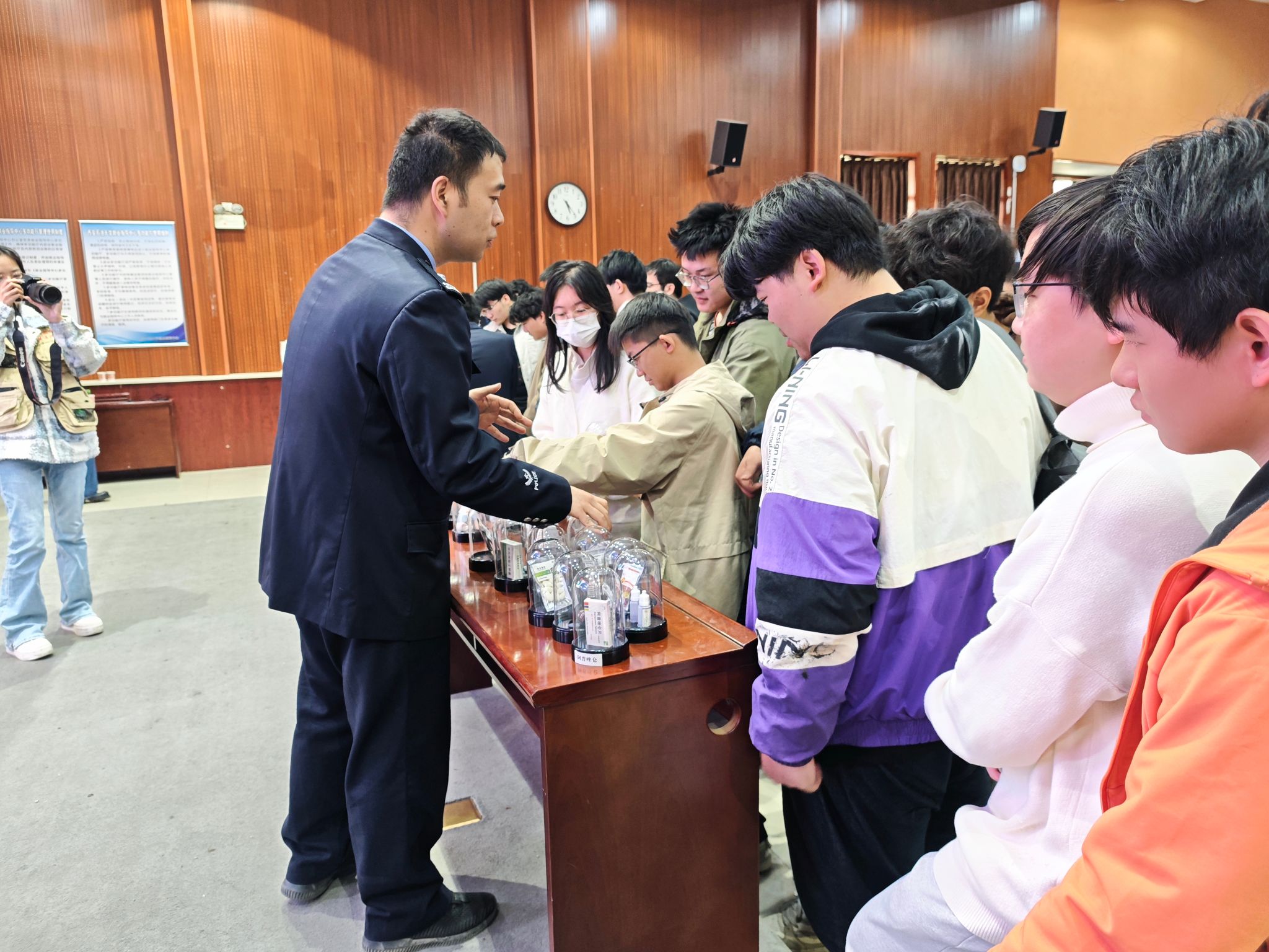 講座臨近結(jié)束時(shí),在西安市強(qiáng)制隔離戒毒所與西安市公安局鄠邑分局禁毒大隊(duì)警官們的引領(lǐng)與解說下,同學(xué)們有序地圍攏至仿真毒品模型展示區(qū),近距離了解到毒品的常見形態(tài)及其偽裝形式。通過這一互動(dòng)環(huán)節(jié),同學(xué)們不僅親眼目睹了毒品的多變面貌,還借助毒品宣傳板的豐富內(nèi)容,進(jìn)一步深化了對(duì)禁毒知識(shí)的理解,增強(qiáng)了自我防護(hù)的警覺性。
