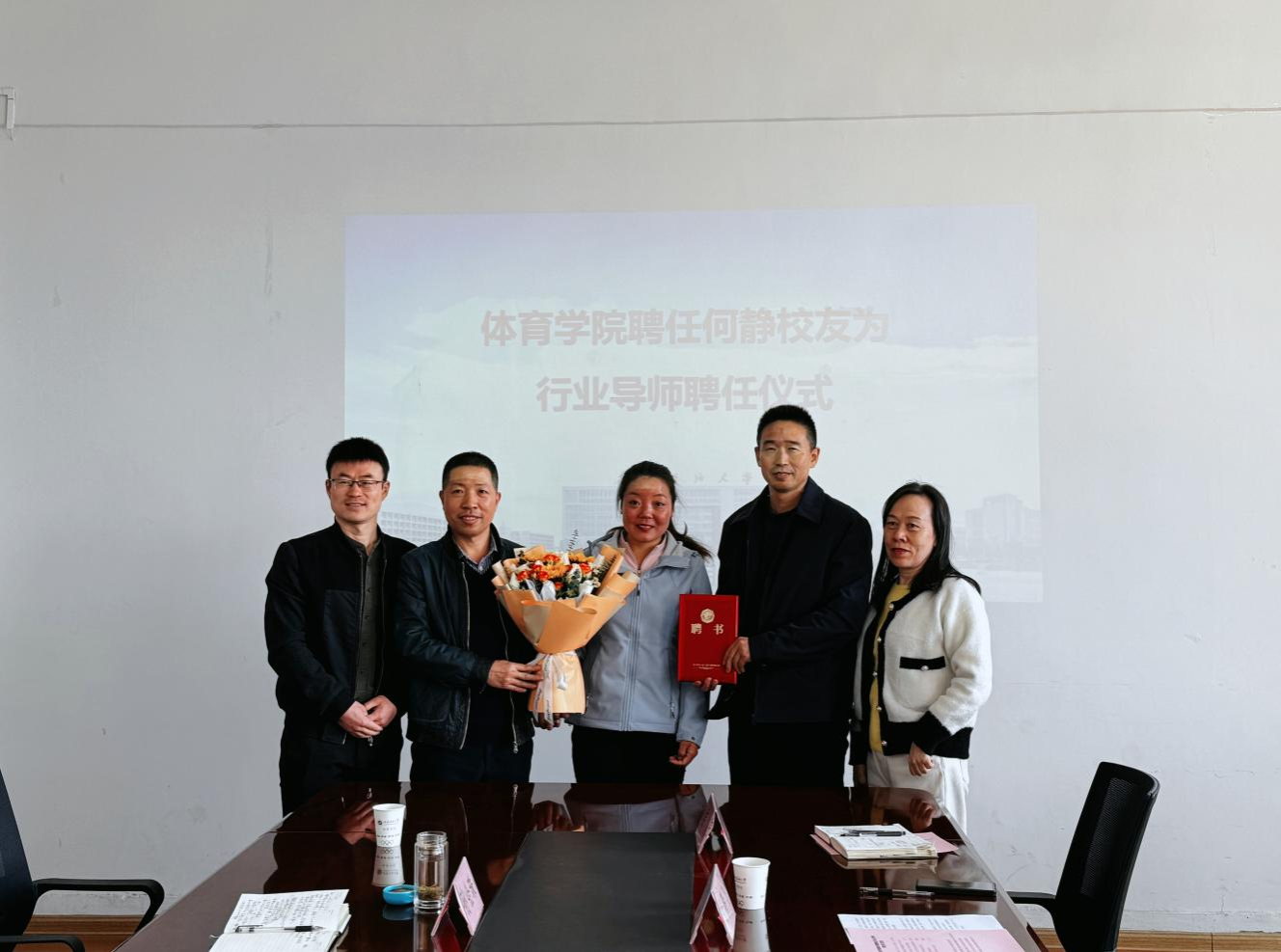 會后,李壽邦代表體育學院向何靜校友頒發(fā)特聘導師聘任證書。
