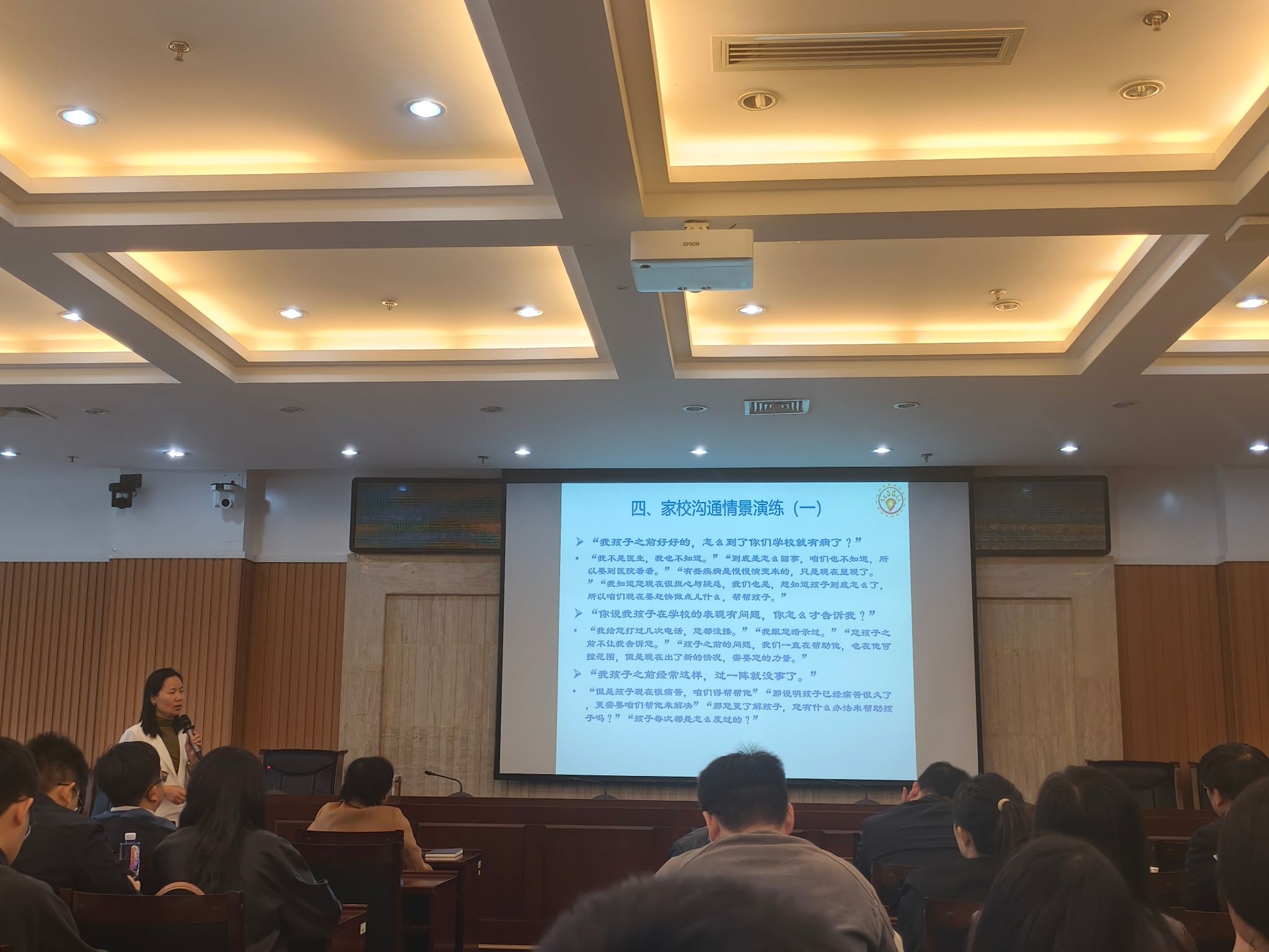 培訓(xùn)開始,肖瓊帶領(lǐng)全體學(xué)工干部進(jìn)行了“驚猴縮脖”和“背后七顛百病消”的小活動(dòng),讓大家直觀地感受了鍛煉中蘊(yùn)含的情緒變化,為大家?guī)砹巳碌捏w驗(yàn)。然后肖瓊從大學(xué)生心理危機(jī)界定、背景知識(shí)、以聯(lián)盟式溝通促質(zhì)量提升、高校溝通情景演練等四個(gè)方面深入淺出地介紹高校學(xué)生心理工作中的關(guān)系難題、法律保障、家校溝通的原則、流程、話術(shù)和寶貴經(jīng)驗(yàn)等。培訓(xùn)通過一個(gè)個(gè)鮮活的案例,既有理論的解讀,也有實(shí)踐的分享,對(duì)于提升我校學(xué)工干部的心理危機(jī)預(yù)防和干預(yù)能力,做好新時(shí)代大學(xué)生的日常教育管理與服務(wù)工作具有現(xiàn)實(shí)的指導(dǎo)意義。