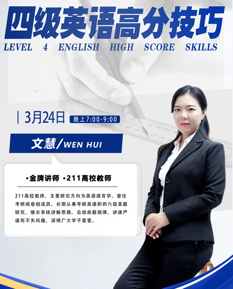 3月24日,計(jì)算機(jī)學(xué)院在鄠邑校區(qū)博覽樓B101室舉辦了全國(guó)大學(xué)英語(yǔ)四級(jí)考試輔導(dǎo)講座。此次講座邀請(qǐng)從事四級(jí)真題研究的資深老師文慧主講,學(xué)院近200名學(xué)生參加了講座。