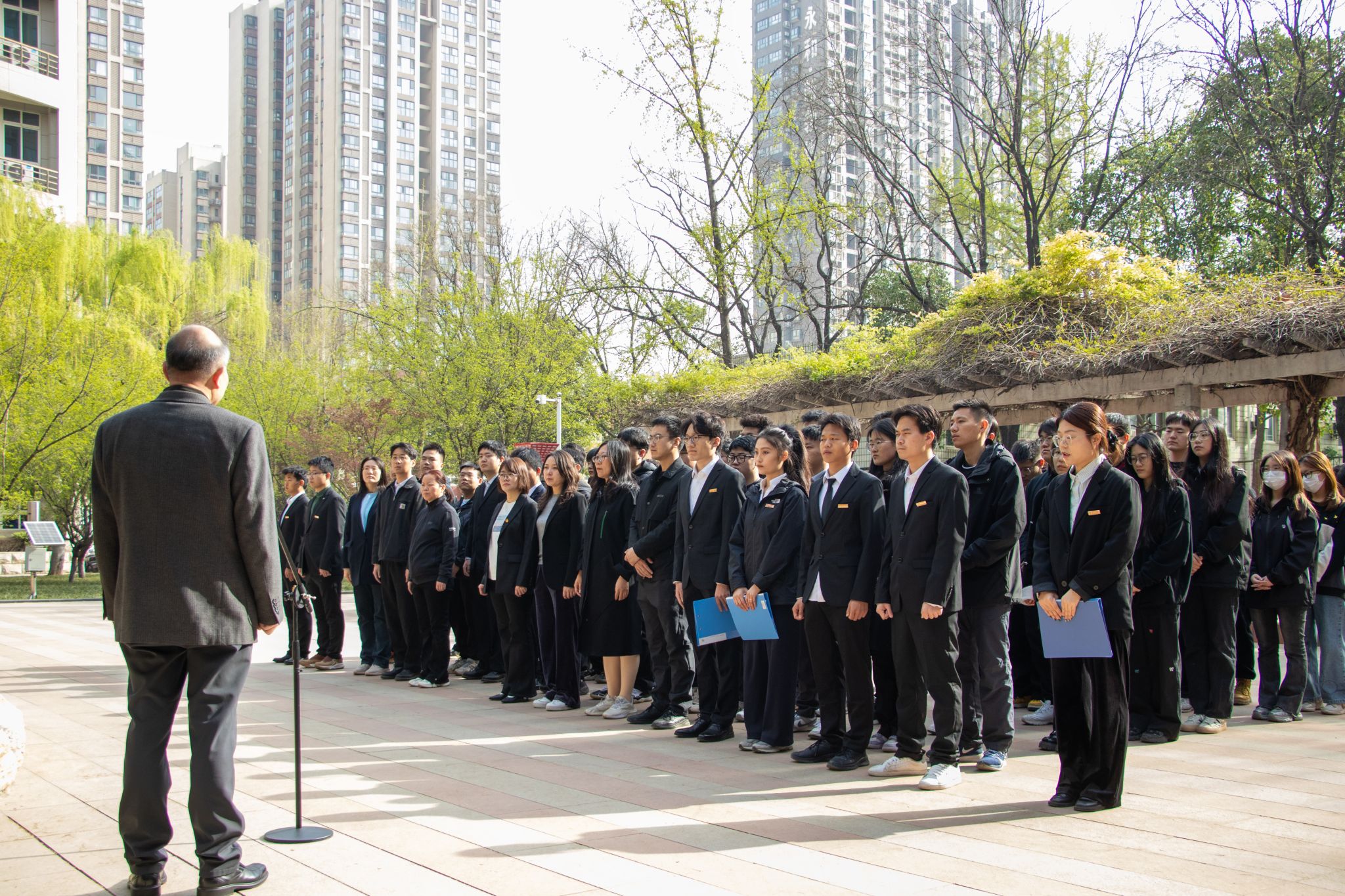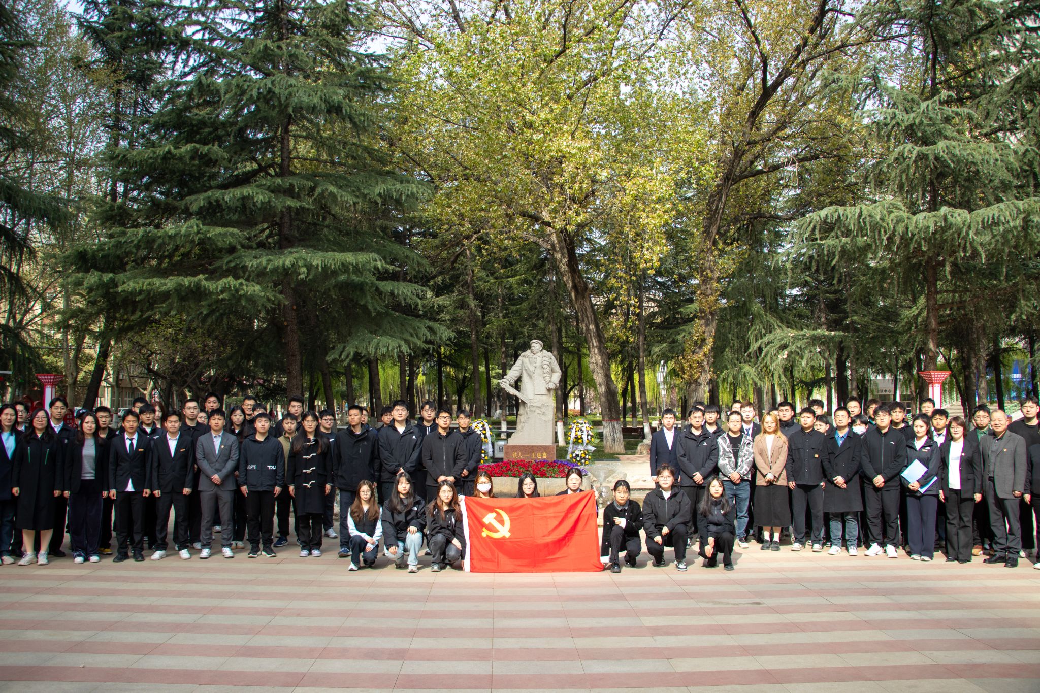 晨光中,鐵人塑像巍峨矗立,寄托著無盡追思。研究生代表緩步上前,將寄托著師生敬意的花籃敬獻于雕像前,與會師生向鐵人王進喜塑像三鞠躬,表達對鐵人王進喜的緬懷和崇敬之情。