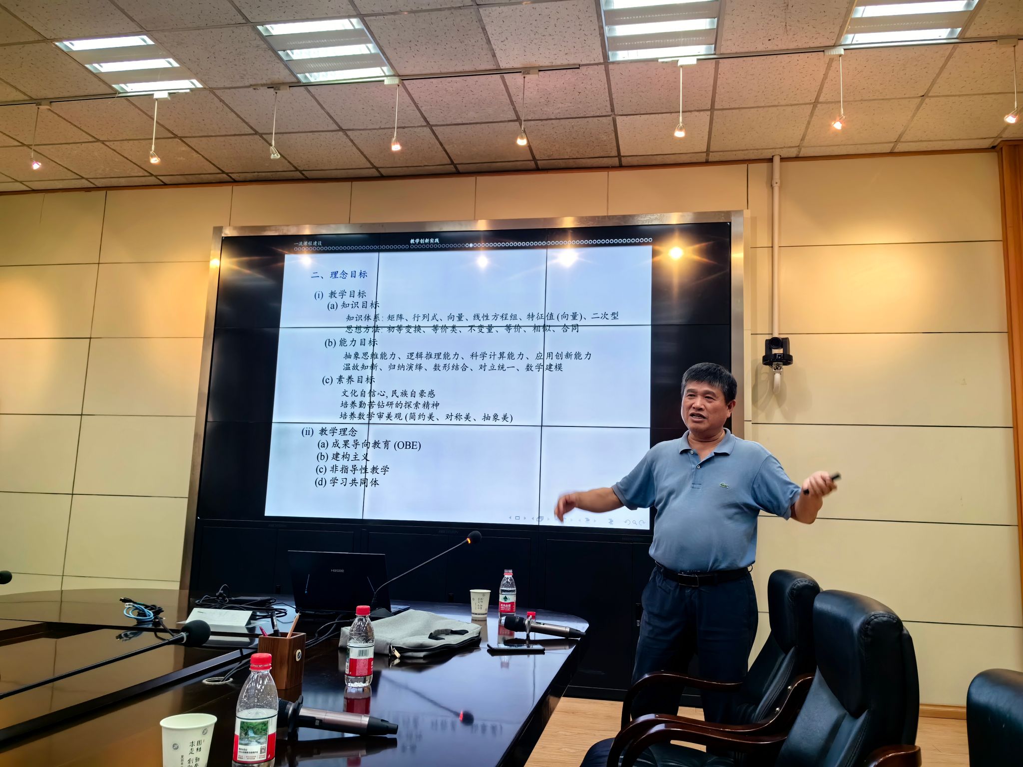 報告會上,陳建龍教授分享了國家級課程建設、精品教材建設、青年教師教學競賽、教學創(chuàng)新大賽的歷程、經(jīng)驗與思考,同時對課程思政怎樣融入課堂教學與一流課程申報提出了一些很好的建議,并分享了團隊在線性代數(shù)課程資源開發(fā)方面的經(jīng)驗。他強調(diào),東南大學線性代數(shù)課程教學團隊在編寫線性代數(shù)教材時,注重理論與實際相結(jié)合,同時也融入了Matlab軟件、數(shù)學建模思想、學科前沿知識和實際應用場景,使學生能更好地理解抽象的數(shù)學概念。教學團隊建設了豐富的多媒體教學資源,包括先修課程的錄制、精心制作的教學視頻、在線課程平臺等。隨后,陳建龍教授分享了他對AI輔助教學的思考與探索。