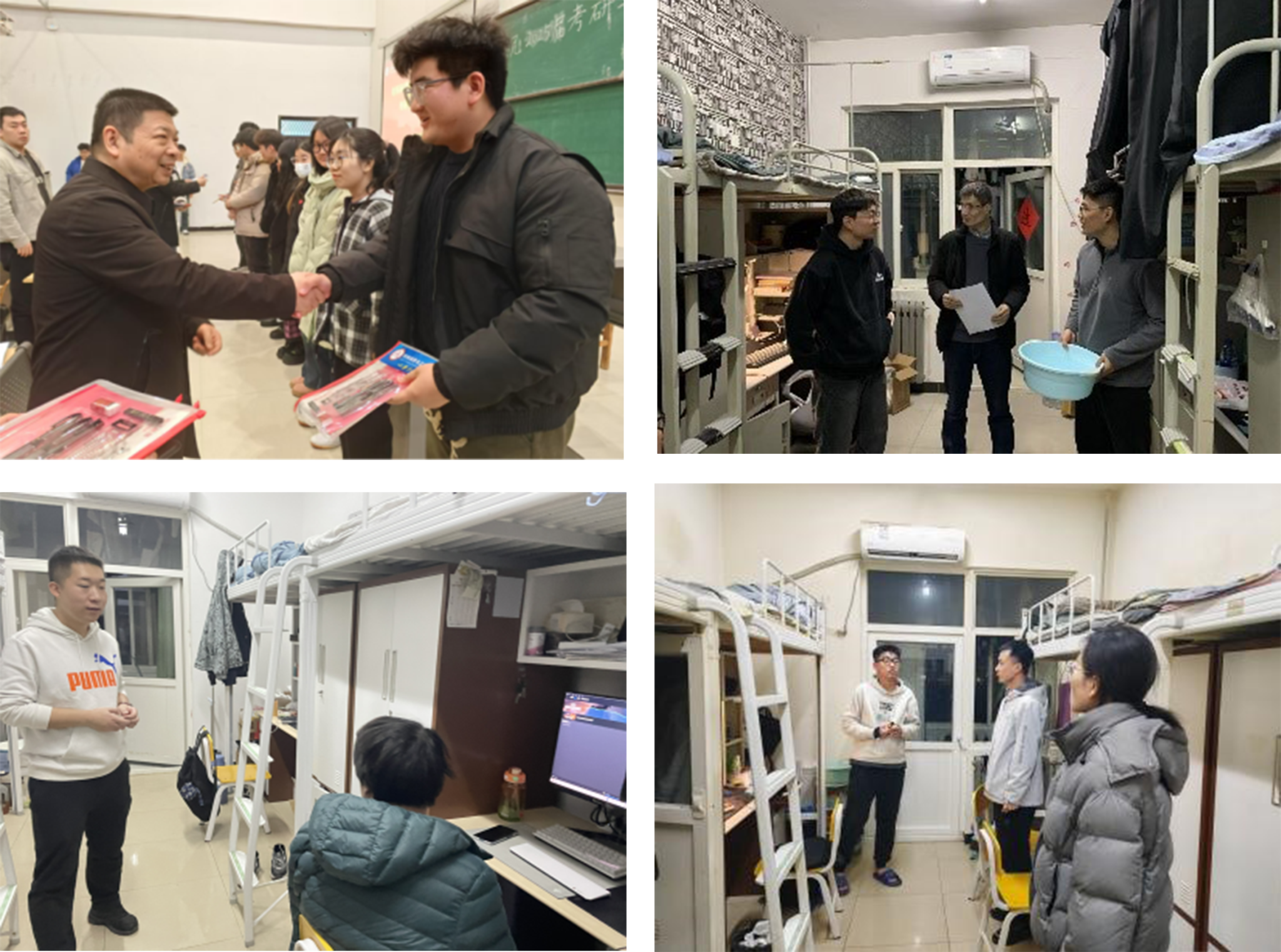 暖心護航,保障無憂。學(xué)院長期開放天工樓考研自習(xí)室,并配備飲水機、空調(diào)等設(shè)施以滿足考研學(xué)生需求。考研沖刺階段,學(xué)院黨政領(lǐng)導(dǎo)深入自習(xí)室為考研學(xué)子發(fā)放印有“夢想成真”字樣的“考研加油大禮包”,并鼓勵同學(xué)們勞逸結(jié)合,合理安排時間,確保在備考期間保持充沛的精力,以最佳狀態(tài)迎接即將到來的考試。學(xué)院畢業(yè)年級輔導(dǎo)員、班主任定期深入學(xué)生宿舍了解考研學(xué)生思想動態(tài)及備考困難,針對各類問題及時溝通協(xié)調(diào)。學(xué)院團委、學(xué)生會通過開展公眾號考研信息推送、考研學(xué)生準考證打印、考研祝福視頻拍攝、考試期間物品保管等一系列暖心服務(wù),為奮戰(zhàn)在一線的考研學(xué)子保駕護航。