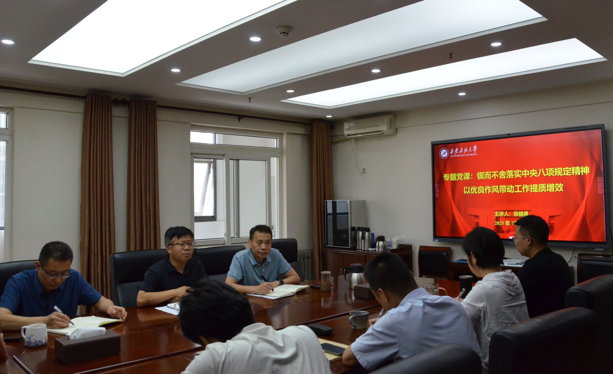 最后,張驍勇以“鍥而不舍落實中央八項規(guī)定精神以優(yōu)良作風帶動工作提質(zhì)增效”為題進行了專題黨課講授。他首先分析了當前廉政風險的現(xiàn)狀和特點,闡述了落實管黨治黨責任、加強廉政修養(yǎng)等方面的重要性。同時,結(jié)合繼續(xù)教育工作,他談到學院要堅持以習近平新時代中國特色社會主義思想為指導,以深入貫徹中央八項規(guī)定精神學習教育為突破口,開啟作風建設新時代,堅持政治引領、堅持服務終身學習、堅持問題導向,嚴格落實中央八項規(guī)定精神,積極將作風建設成效轉(zhuǎn)化為繼續(xù)教育發(fā)展的新動能。