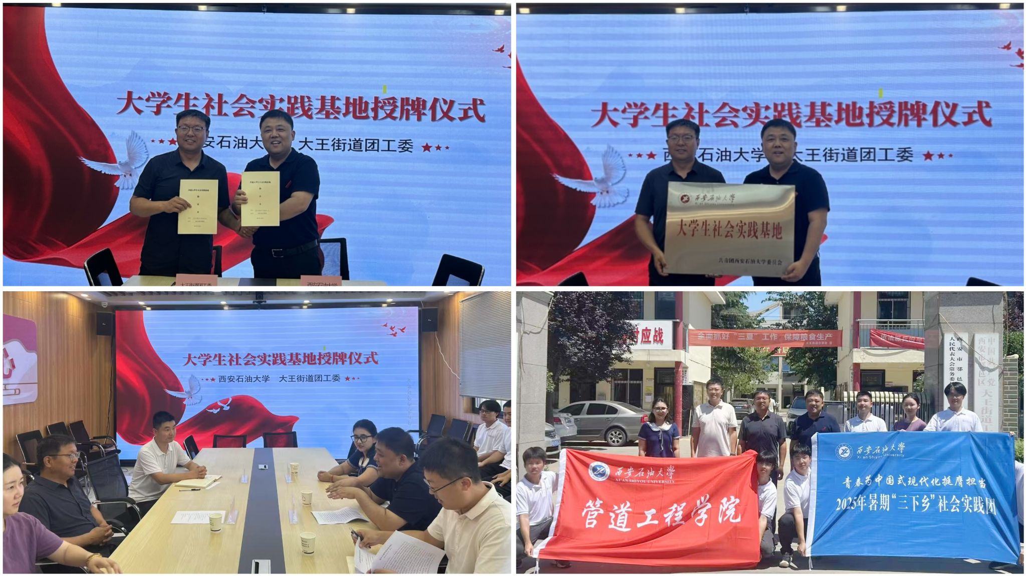 隨后,師生一行來到大王街道辦事處,與相關(guān)負(fù)責(zé)人進(jìn)行了交流座談,并簽署了共建大學(xué)生社會實踐基地協(xié)議書,舉行授牌儀式。雙方就如何開展社會實踐活動、加強(qiáng)校地合作進(jìn)行了深入探討。大王街道辦負(fù)責(zé)人表示,大王街道將積極為大學(xué)生提供實踐崗位和資源支持,協(xié)同學(xué)院打造“1+N”實踐體系,即以基地為樞紐,聯(lián)動開展主題黨團(tuán)日、專業(yè)實習(xí)、創(chuàng)新創(chuàng)業(yè)等多元活動,助力大學(xué)生在社會實踐中受教育、長才干、作貢獻(xiàn)。