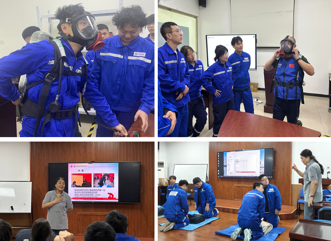 教學(xué)團(tuán)隊(duì)圍繞“海上油田安全優(yōu)先”,講解安全用具使用與維護(hù),演示正壓式空氣呼吸器等裝備穿戴;結(jié)合案例引導(dǎo)學(xué)生多維度評(píng)估海上平臺(tái)風(fēng)險(xiǎn),樹(shù)立“預(yù)防為先”理念。而后的應(yīng)急技能培訓(xùn)則側(cè)重實(shí)戰(zhàn),學(xué)生分組演練心肺復(fù)蘇術(shù)(CPR)與自動(dòng)體外除顫儀(AED)操作,并模擬煙熱環(huán)境中的火災(zāi)逃生,強(qiáng)化應(yīng)急自救能力。