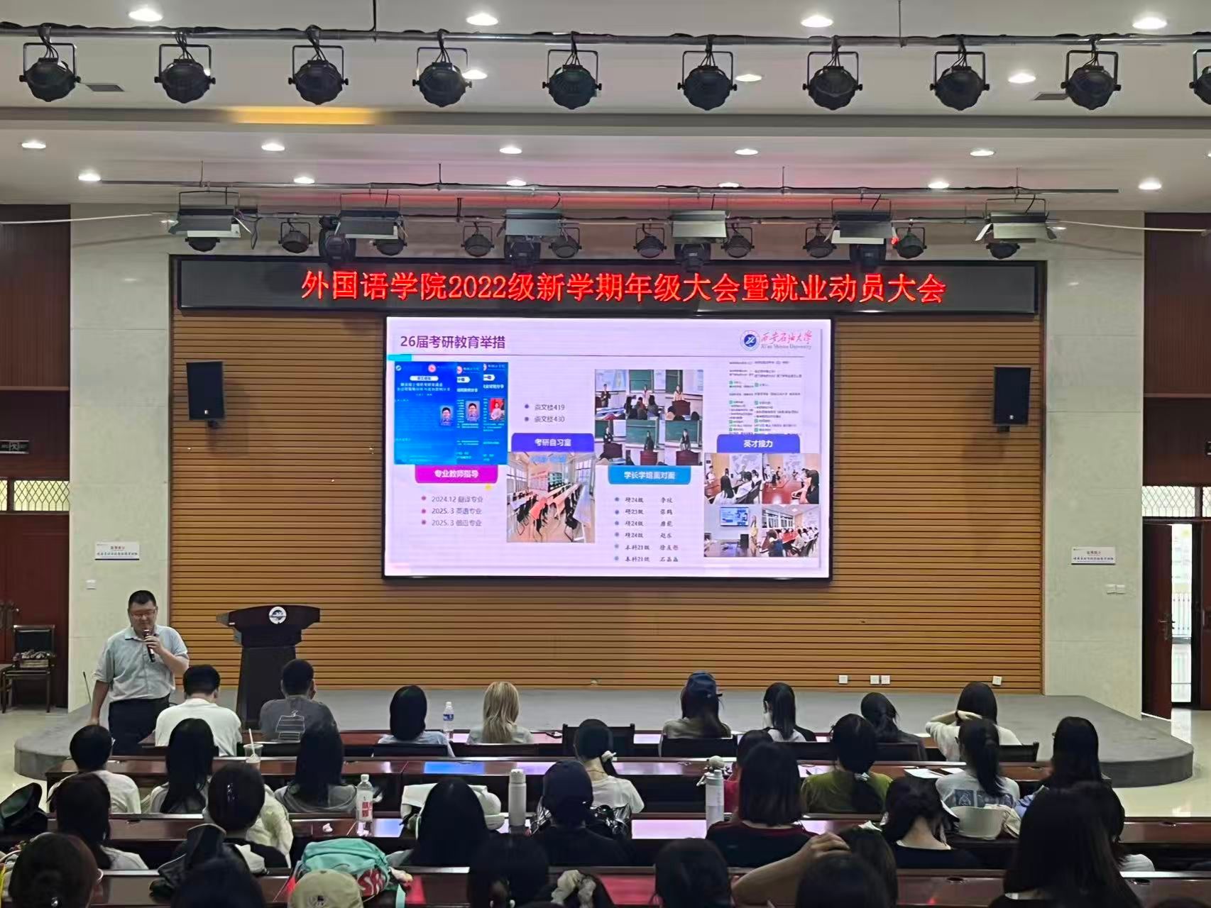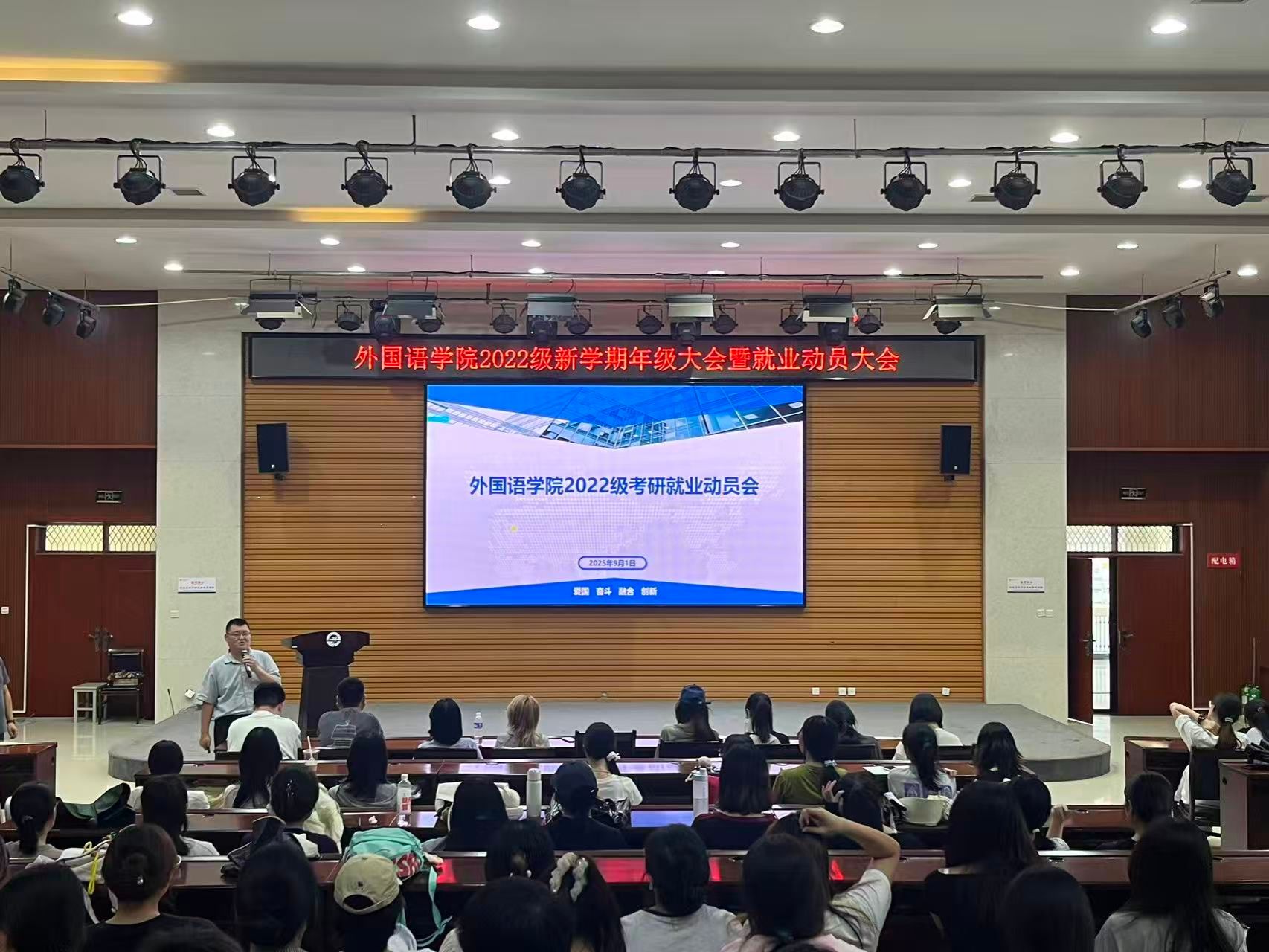 為貫徹落實學校工作要求,引導畢業(yè)生樹立正確就業(yè)觀念,提高就業(yè)積極性和主動性,助力畢業(yè)生順利求職升學,9月1日,外國語學院在崇文樓108室召開2026屆畢業(yè)生就業(yè)動員大會。外國語學院黨委副書記、畢業(yè)班輔導員、學院畢業(yè)生近200人參加會議。會議由院團委書記陳浩主持。