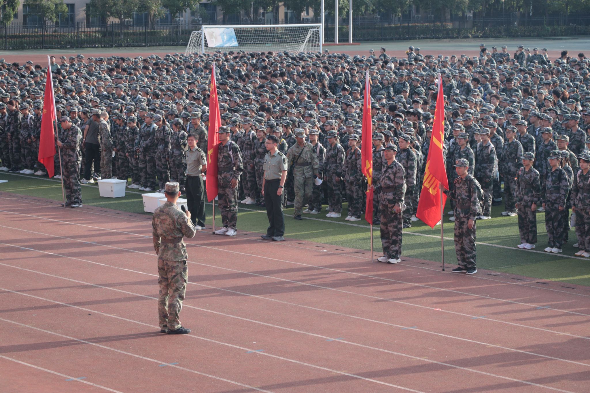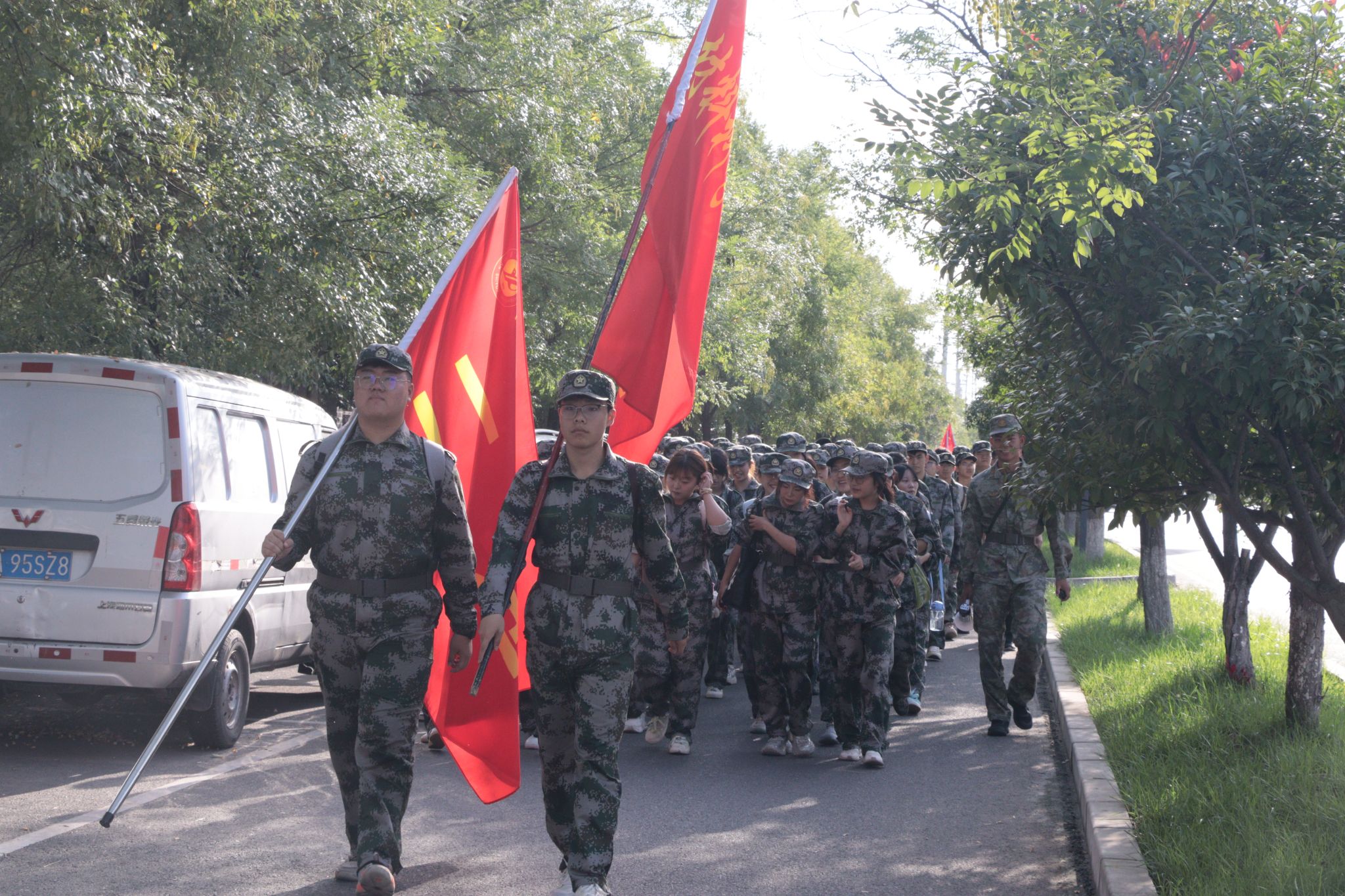 7:50,全體新生在東區(qū)操場集結(jié)完畢,按一營、二營、三營、四營的順序,以連為單位成四路縱隊(duì)依次出發(fā),拉練路線以東區(qū)操場為起點(diǎn),經(jīng)學(xué)校東門出、北門進(jìn),沿途設(shè)置4個(gè)調(diào)整點(diǎn)。各連隊(duì)間隔保持20-30米,行軍速度控制在3公里/小時(shí)。上午11:30,全體新生順利返回東區(qū)操場。